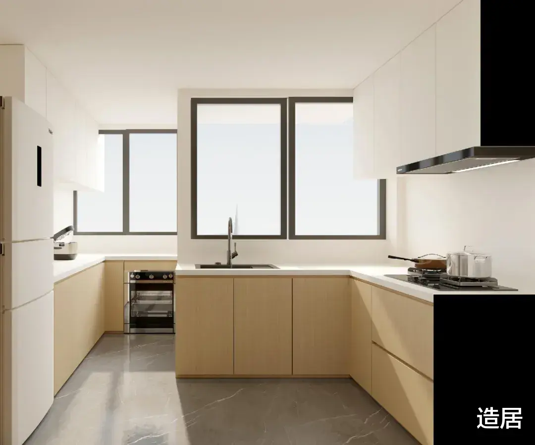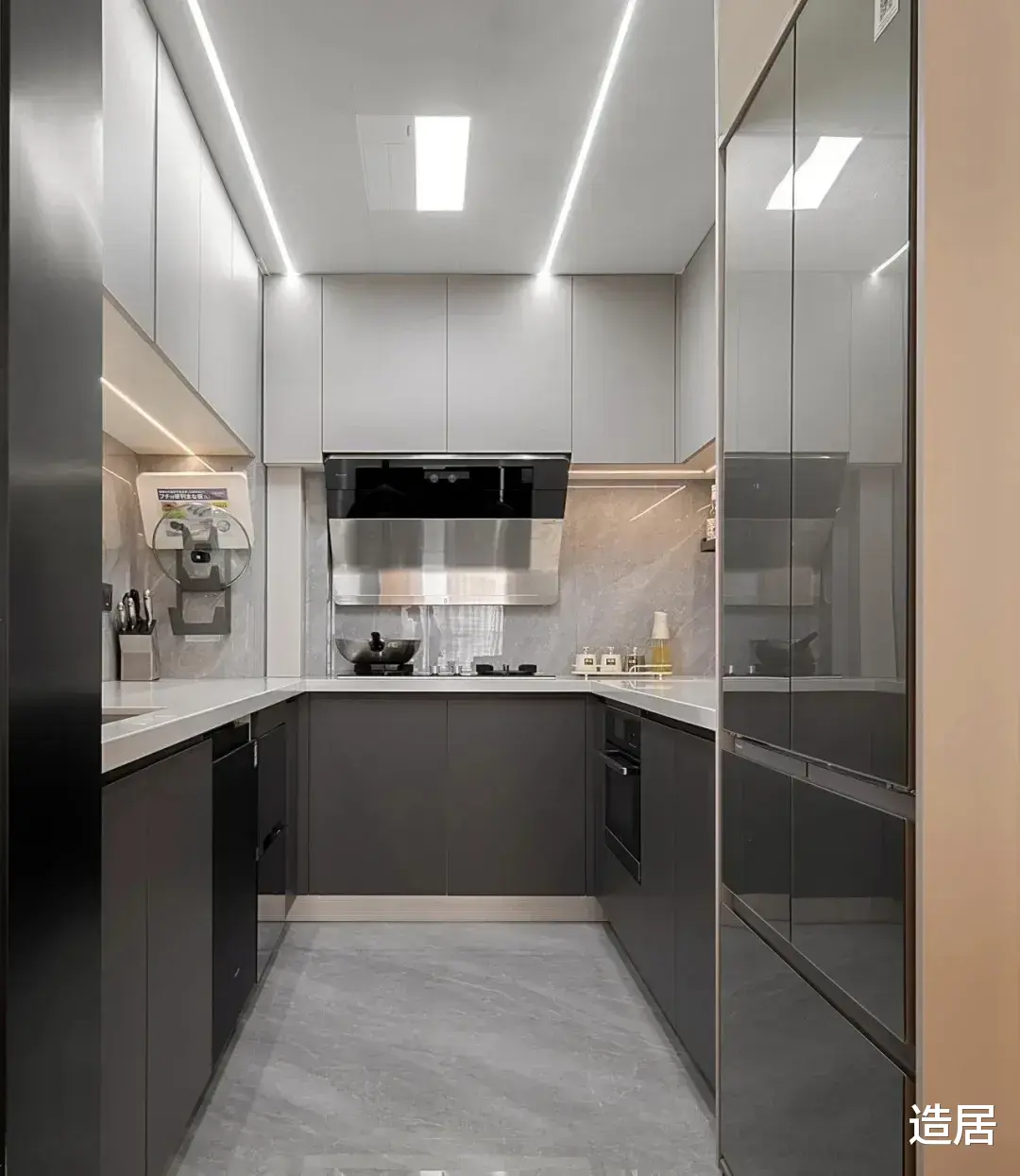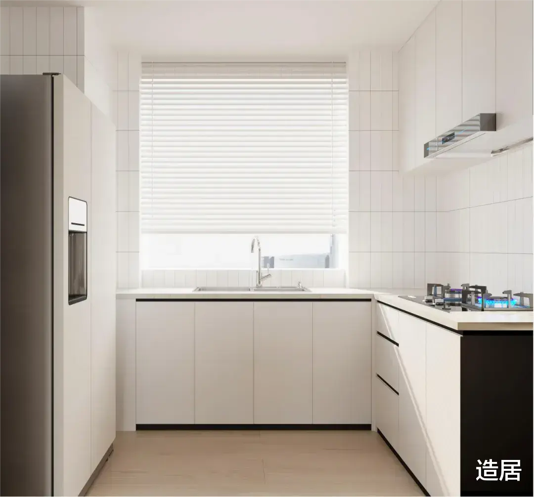 比如一面墙放冰箱和水槽(取 + 洗),另一面墙放台面和灶台(备 + 炒),两个区域通过直角衔接,转身就能完成洗、备、炒的切换,不用来回绕路。
