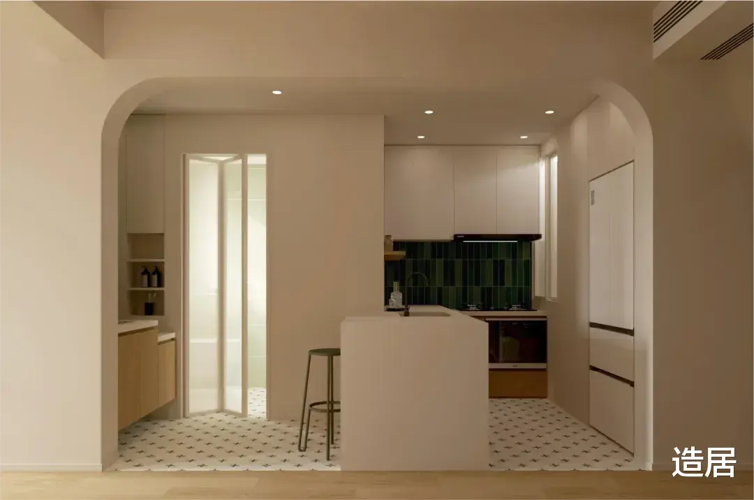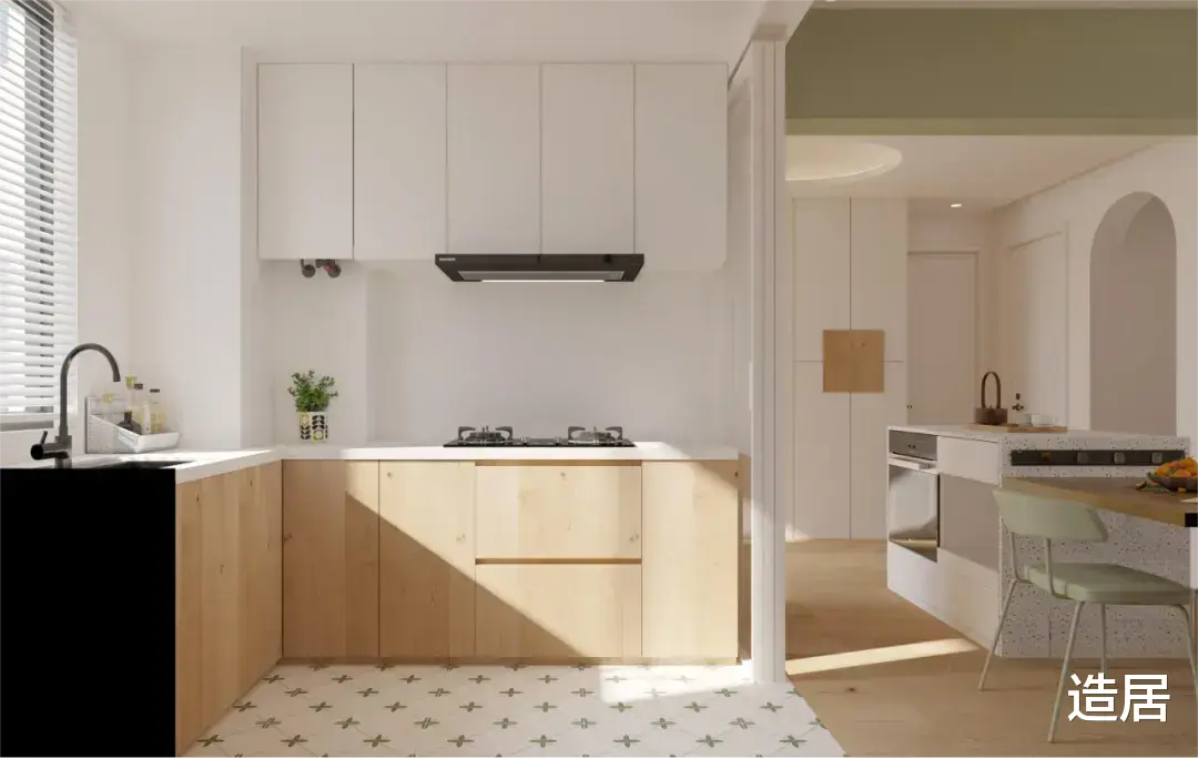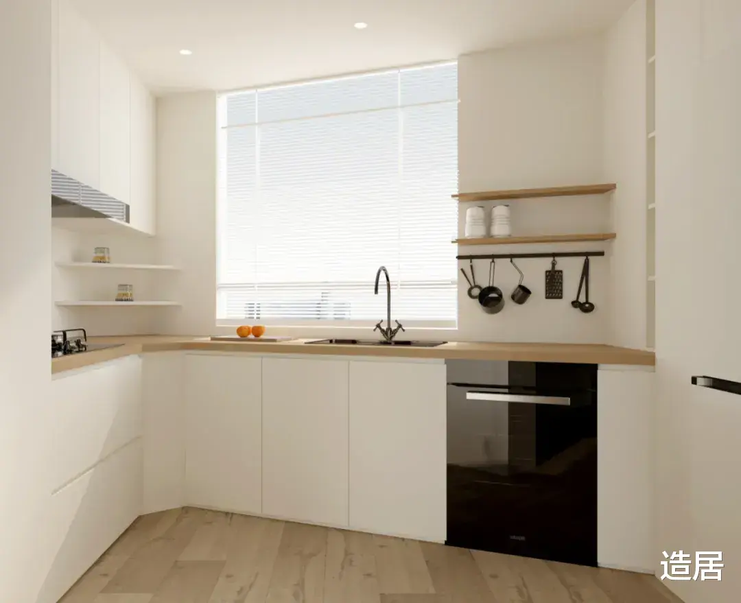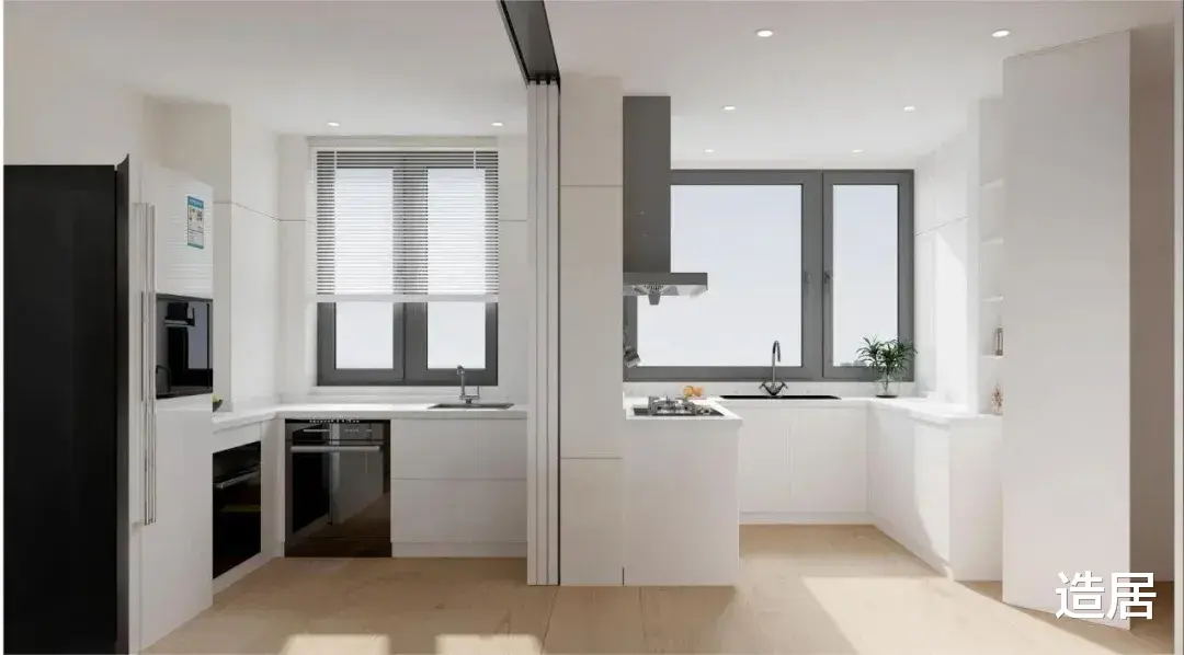 比如一面墙放冰箱和水槽(取 + 洗),另一面墙放台面和灶台(备 + 炒),两个区域通过直角衔接,转身就能完成洗、备、炒的切换,不用来回绕路。