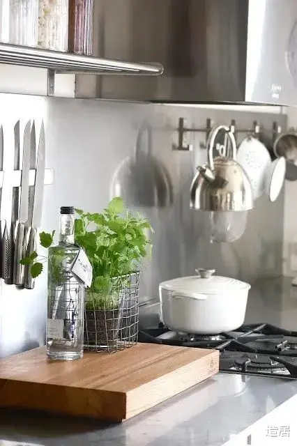 台面的尺寸也很关键:备菜台面至少要留 60 厘米以上的长度,比如水槽右边留 80 厘米台面,能同时放下菜板、装菜的盘子、削皮器等工具;台面上不要放太多小家电,比如电水壶、面包机,这些会占用备菜空间。