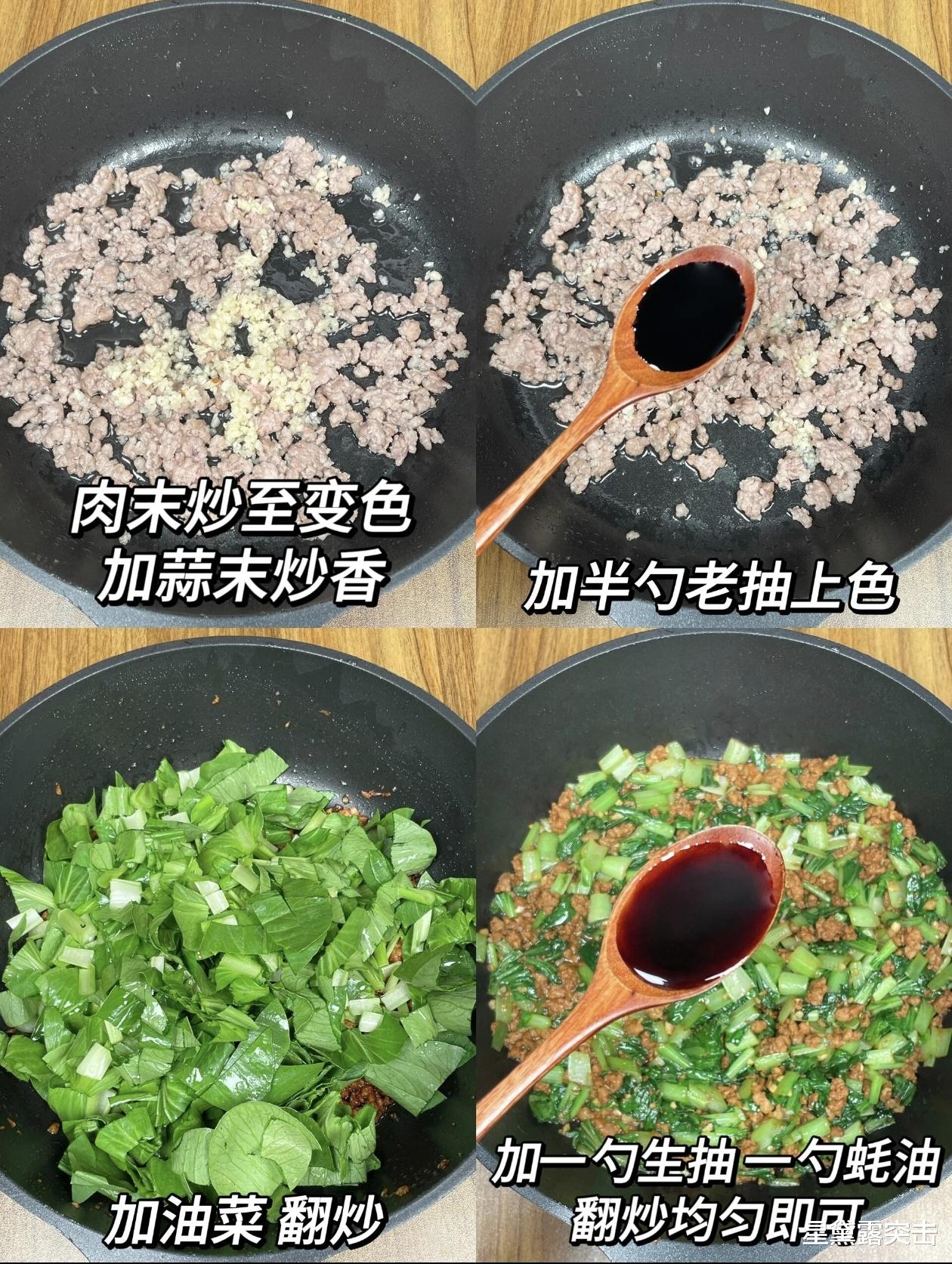 随后放入沥干水分的小油菜,转大火快速翻炒,这一步是小油菜保持翠绿脆嫩的核心,切记不可小火慢炒,否则菜叶容易发黄变软,失去爽脆口感。大火翻炒约一分钟,看到小油菜微微变软、叶片变得透亮,立刻加入两勺生抽、一勺蚝油,撒上少许盐和一小撮白糖提鲜,白糖能中和咸味,让整体味道更鲜甜,无需再加其他调料,避免掩盖食材本味。继续大火翻炒三十秒,让调料充分包裹每一片油菜和肉沫,待所有食材完全融合,油菜依旧翠绿,肉沫鲜香浓郁,即可关火出锅。