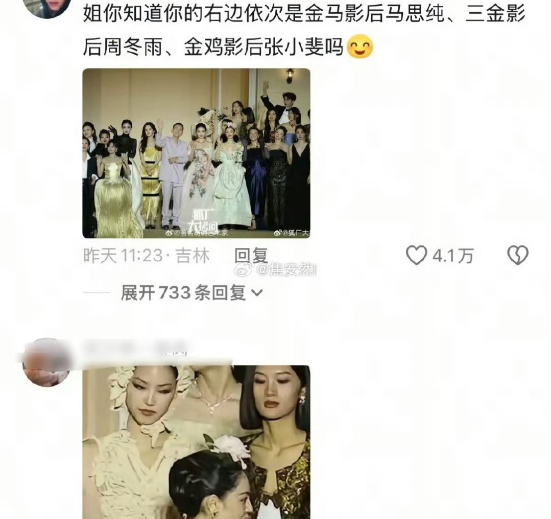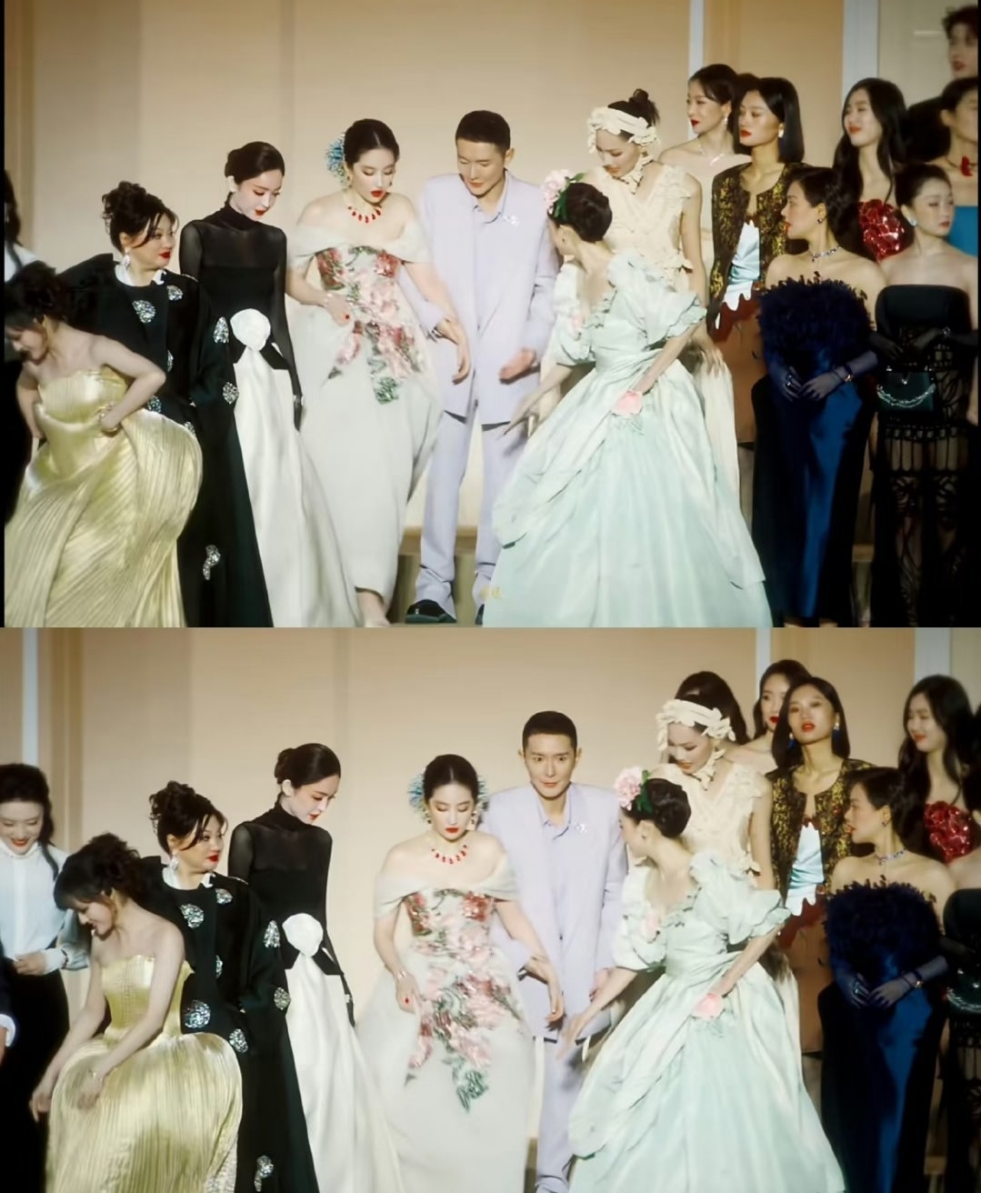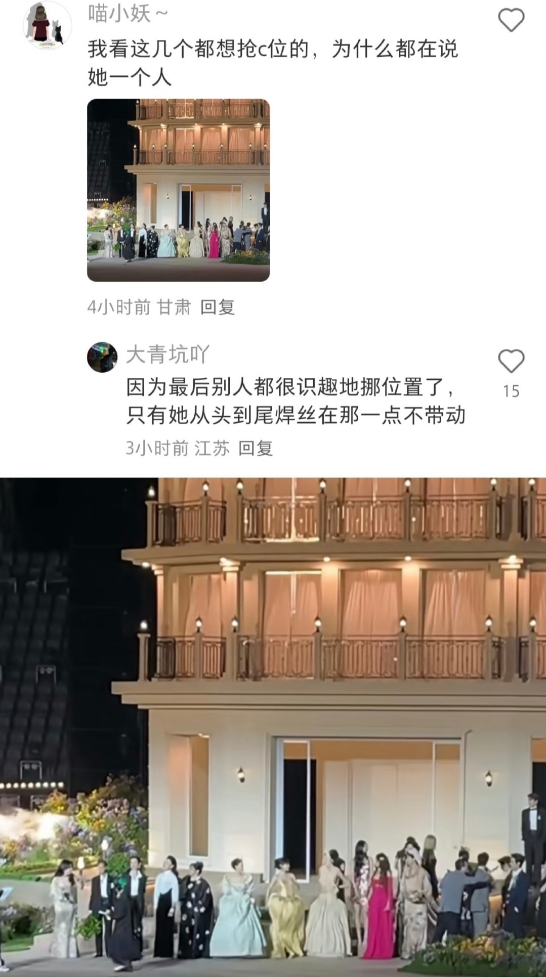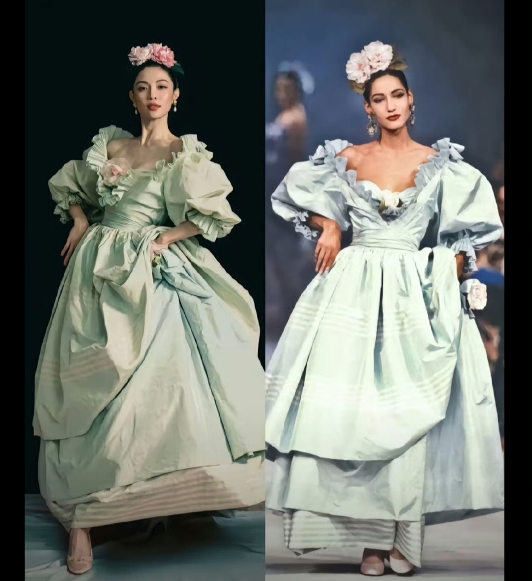 但另一角度视频显示,钟楚曦曾抬手示意刘亦菲往中间靠拢,试图化解站位尴尬。粉丝则强调其造型与活动主题的高度契合——身着1987年Nina Ricci古董高定礼服,头戴牡丹发饰,完美呼应“百花齐放”主题,站在中心更符合视觉逻辑。这场争议的本质,是公众用影视圈的“咖位规则”丈量时尚场的站位,而主办方未明确指令的“自由调整”规则,则将艺人推入舆论漩涡。