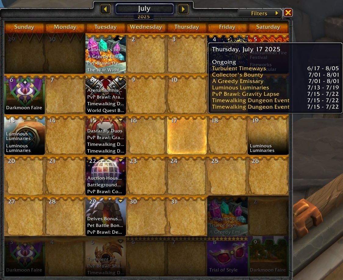 通过数据挖掘发现,新活动将于7月17日启动,持续28天,直到8月14日。这个活动周期有点不寻常,并且PTR上的游戏日历并没有写明日期,似乎表明神秘运势之风将作为循环活动回归。
