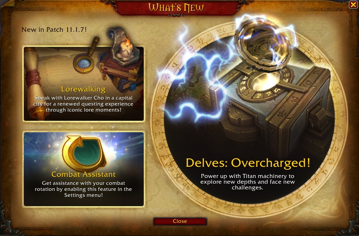 《魔兽世界》11.1.7的PTR更新了启动画面,高亮“游学探奇”、“过载地下堡”和“战斗辅助”。