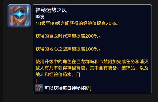 神秘运势之风最初于11.1.5推出,带来20%经验加成,100%地心之战声望加成和200%巨龙时代声望加成,还有几率掉战斗和经验药水。