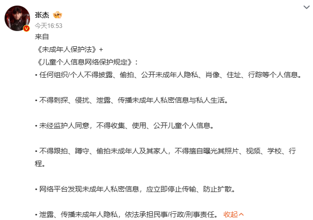 就在大家以为,这事只是谢娜单方面发声、粉丝骂骂狗仔就过去的时候,张杰出手了!不同于谢娜的感性呐喊,沉默寡言的他,这次的回应更直接、更理性、也更“刚”——没有多余的口水战,没有煽情的文案,直接在个人微博发布图文,标题清清楚楚写着“来自《未成年人保护法》+《儿童个人信息网络保护规定》”,图文里详细列举了6条关键法条,明确指出“不得偷拍、公开未成年人隐私、肖像、行踪”“不得跟拍、蹲守未成年人及其家人”,甚至强调“泄露、传播未成年人隐私需承担民事、行政或刑事责任”,最后配文“来自父母的心声,保护孩子,人人有责”。