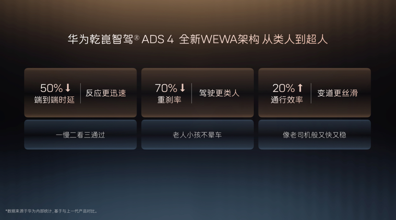 软件层面,新车搭载的华为乾崑ADS 4基于WEWA技术架构,可实现从“模仿人类”到“超越人类”的决策进化,通行效率上提升20%,重刹率降低30%,端到端时延降低50%。全维防碰撞系统CAS 4.0能够精准识别特种车辆、外卖骑手等特殊目标,并对“鬼探头”等突发场景实现微秒级识别与制动响应。