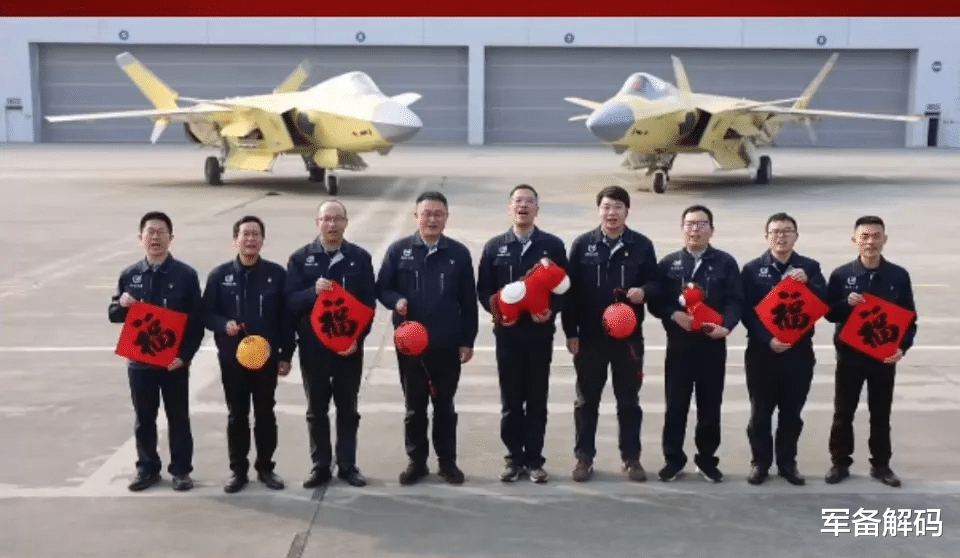 一次在中航成飞的厂房门口,9名着工装的技术人员,手里拿着福字、小马玩偶和灯笼,给全国人民拜年。背景里停着两架仅刷底漆、机腹弹舱和翼根侧弹舱全部打开的“黄皮”歼20A。另一次是央视春晚的节目《战位有我在》,空军某旅直接把两架现役的歼20搬上了停机坪,同样是大开门户,机腹弹舱和侧弹舱全开。