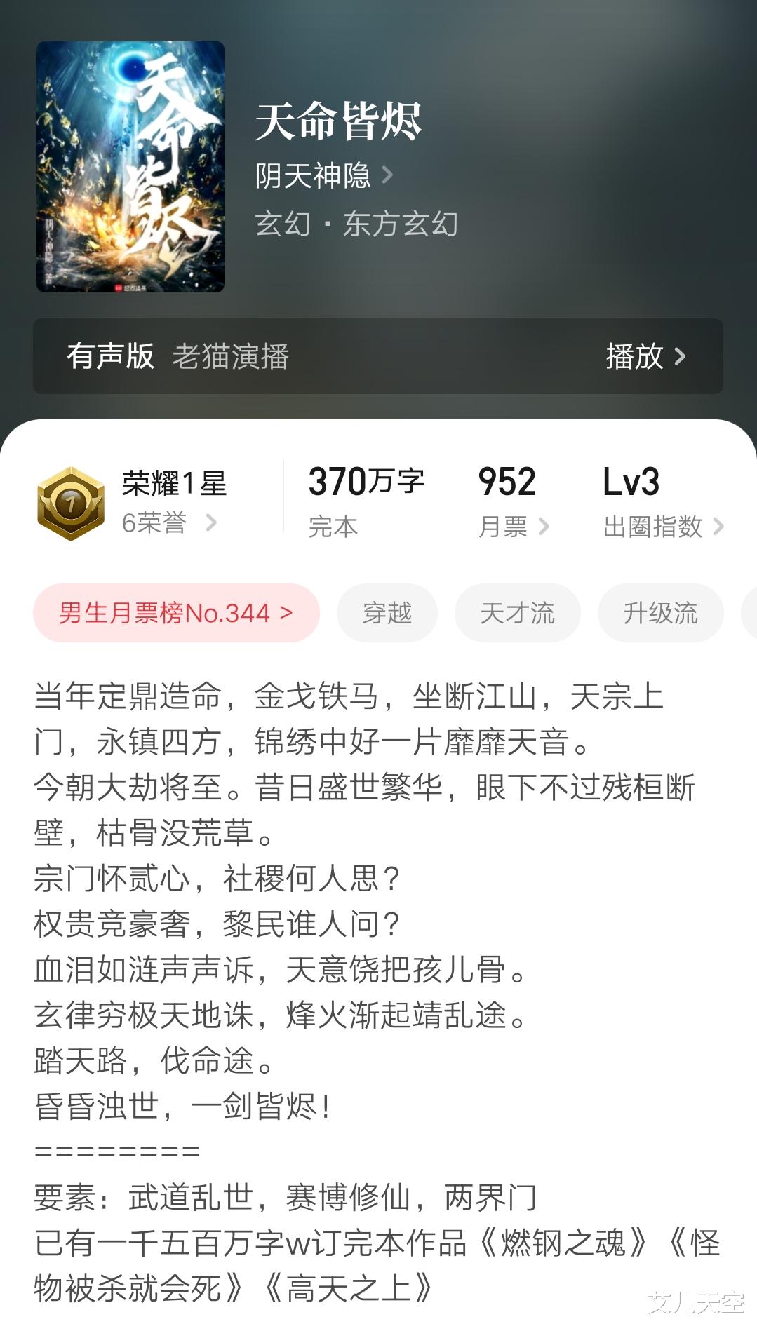 阴天神隐今天发了单章,因为创作状态问题,更新很不稳定,所以决定《天命皆烬》后续内容不再收费。