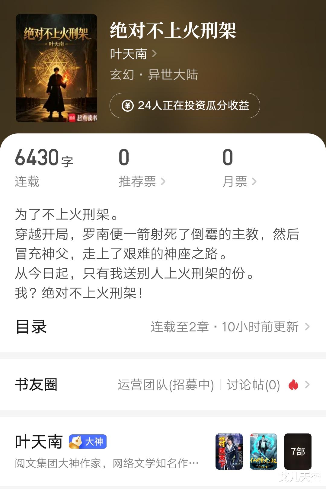 大神叶天南昨天开了西幻新书《绝对不上火刑架》,主角意外穿越穿越异世界,开局正被一个神父惩罚。原来前身被自己喜欢的人骗了来给神父下毒。