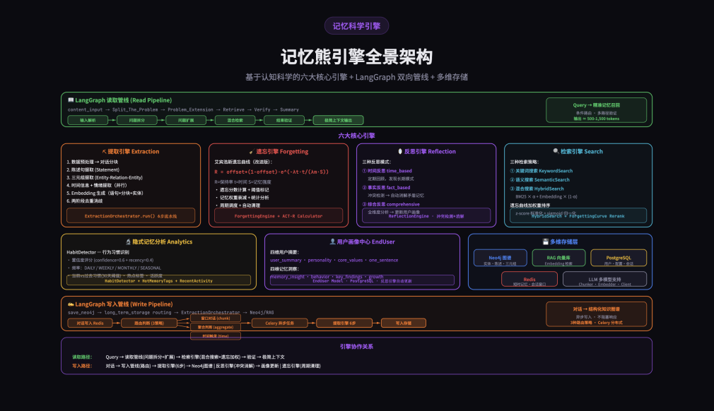 1.用户发起query输入,同步发送至OpenClaw框架与深度集成的记忆熊引擎;