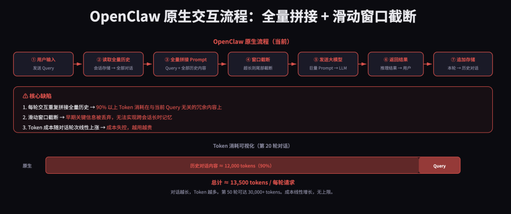 OpenClaw等主流大模型交互框架的原生上下文管理模式,本质上是基于滑动窗口的全量历史拼接机制:每一轮用户交互,都需要将当前query与该会话的全量历史对话内容完整拼接,组装成符合模型要求的Prompt后送入大模型推理。这种模式存在三个无法解决的记忆缺陷: