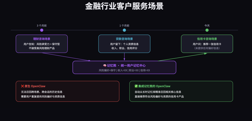 当用户再次通过OpenClaw开发的信用卡咨询场景进行交互时,原生OpenClaw框架无法召回跨场景、跨会话的历史信息,需要用户重复提供个人资质与风险偏好信息;而集成了记忆熊的OpenClaw框架,会自动从用户的长时记忆库中,精准召回相关的核心信息,无需用户重复说明,就能为用户推荐符合其风险偏好与资质的信用卡产品,大幅提升了用户体验与转化效率。