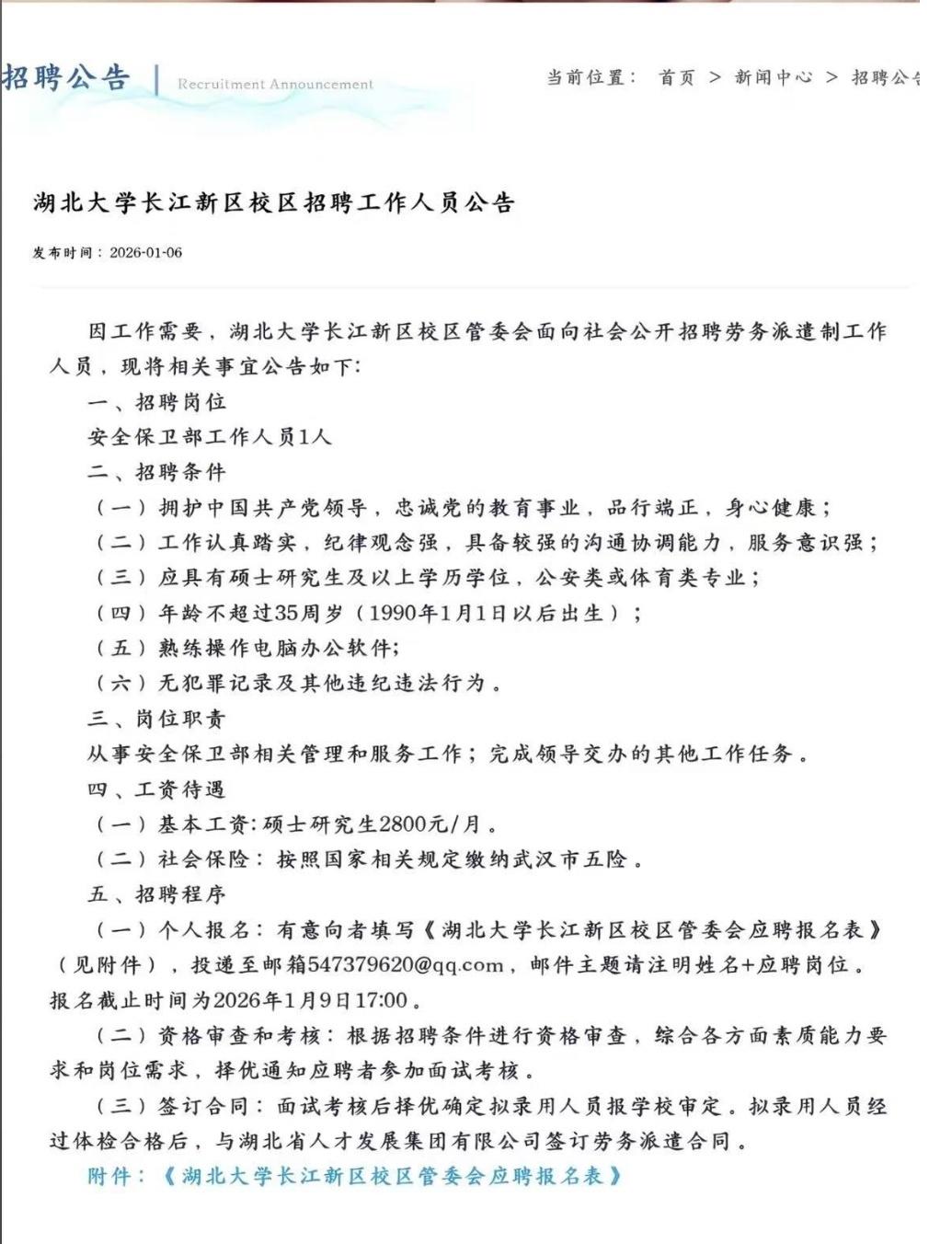 这事怎么起的,源头是一份招聘公告,湖北大学长江新区校区发的,岗位写安全保卫部工作人员,只招1人,要求硕士及以上,年龄不超过35岁,电脑办公软件要熟练,报名截止卡在1月9日17点,基本工资标注2800。
