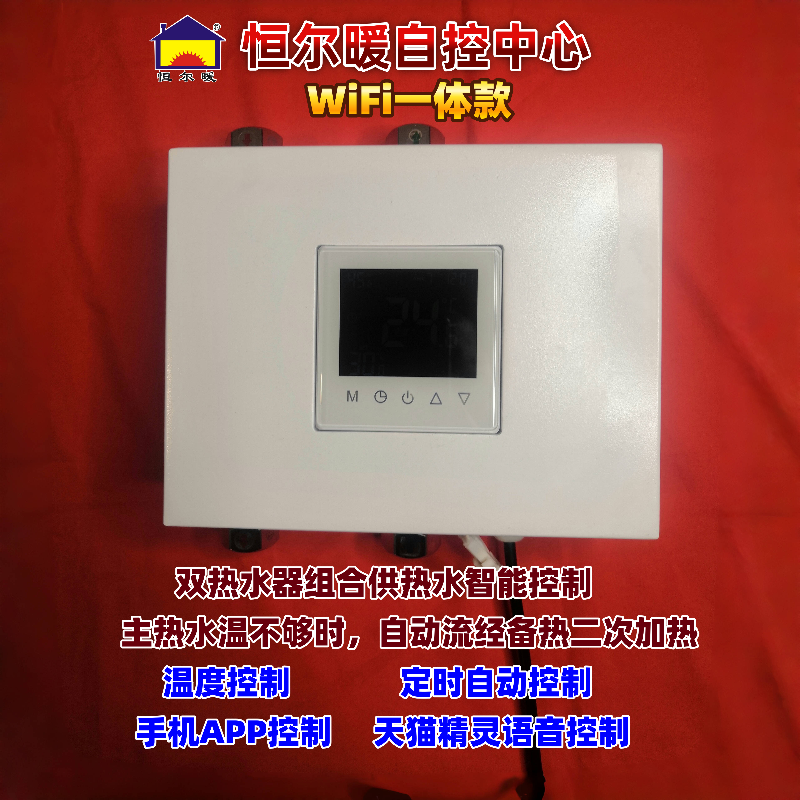 恒暖暖通公司研发的这款自控中心,除了最基本的温度控制外,还具有周编程定时控制,可以每天设置6个时段,每个时段设置不同水温,比如早晨和中午设置30°C,晚上设置40°C,其他不用水时段设置8°C,这样更加节能。现在还开发了WiFi款,可以手机APP远程控制和利用天猫精灵语音控制。除此之外,恒尔暖自控中心还具有低温防冻功能。