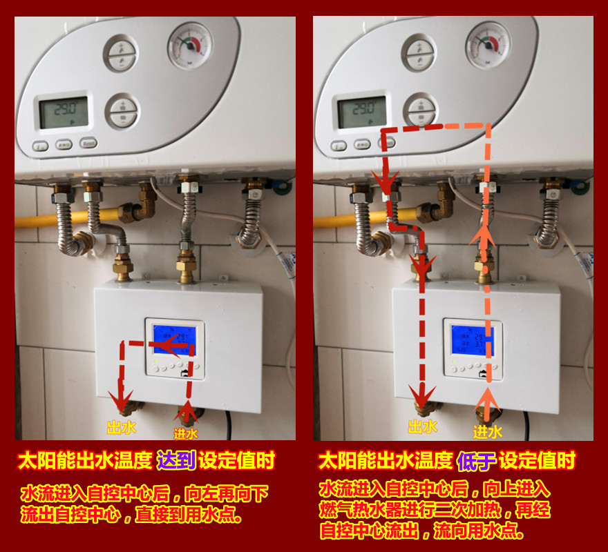 于是我们就在想,能不能发明一个太阳能热水器和燃气热水器组合一起供热水的智能控制装置,只要设置一个温度,太阳能水温够,就只用太阳能的出水,燃气热水器的水阀自动关闭,如果太阳能水温不够时,就自动关闭太阳能的下水,自动打开燃气热水器的进出水阀,这样只要打开水龙头用热水就可以了,不用操心开关太阳能和燃气热水器两边那个水阀了。