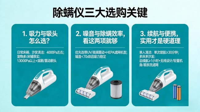 2. 噪音与除螨效率,看这两项就够 居家除螨仪哪个牌子好?优先选带UV/高频震动+HEPA滤网的机型,能杀螨同时减少二次扬尘;噪音低于70dB,吸力又稳定,清洁过程不扰人。低价款吸力小、噪音大,容易用起来烦躁。