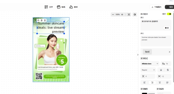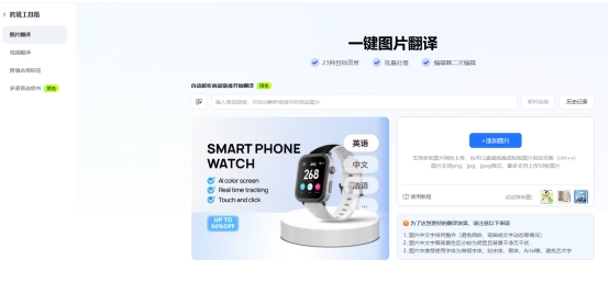 易可图是一款专注于电商领域的设计平台,有着非常多针对电商行业的功能,比如AI换装、AI商品图等,其中自然也包括了翻译,对于电商卖家而言,我们需要翻译的不仅仅是产品标题和描述,更包括了产品图片、营销海报和宣传视频。