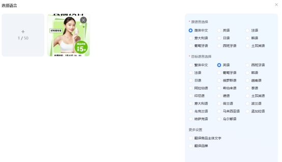 先说说图片翻译吧,如果你只需要一张简单的带文字的产品图片,那你只要上传原图+输入源语种和译文语种就行了。(这里要特别提一句,目前支持 23 种语言哦~)然后点击【立即翻译】按钮就可以啦。当然,除了简单粗暴的全量翻译外,你也可以通过【更多设置】来进一步定制翻译效果。比如你可以选不翻译商品主体以及 Logo 上的文字,这样就不会出现一些奇怪的 AI 翻译结果。