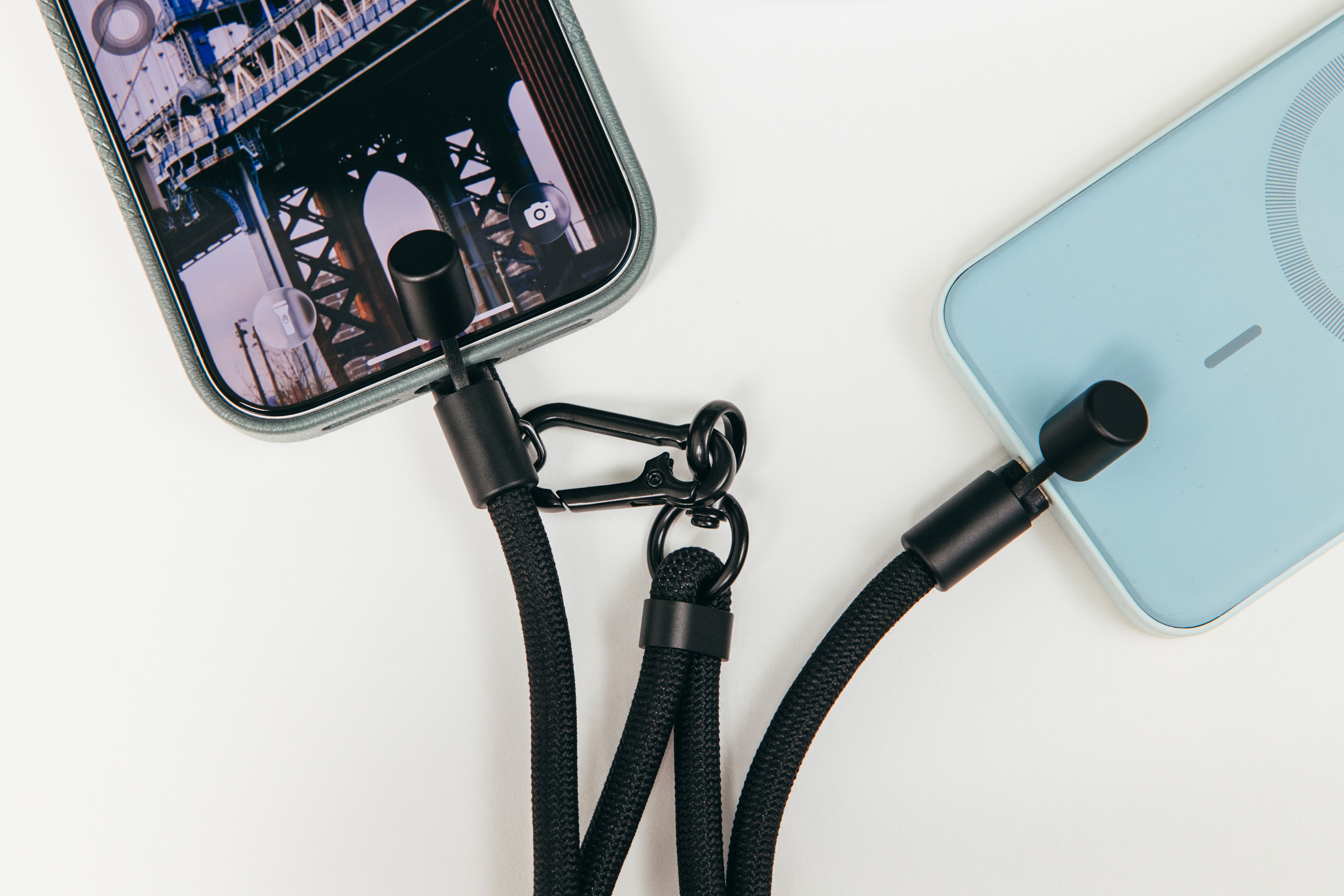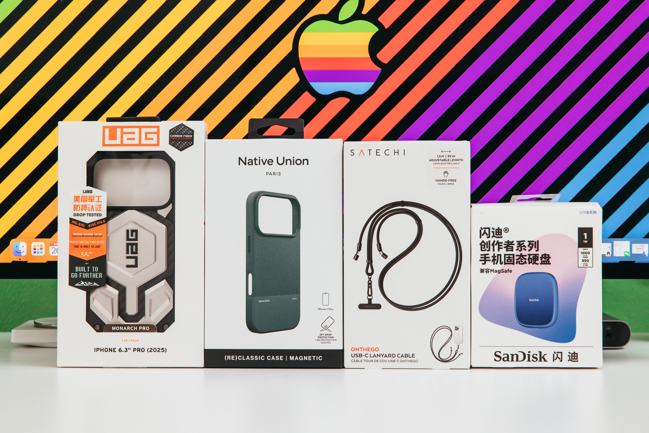 手机壳选了美观和防护各一种,充电线兼顾挂绳功能,以及为拍视频准备的固态磁吸硬盘。