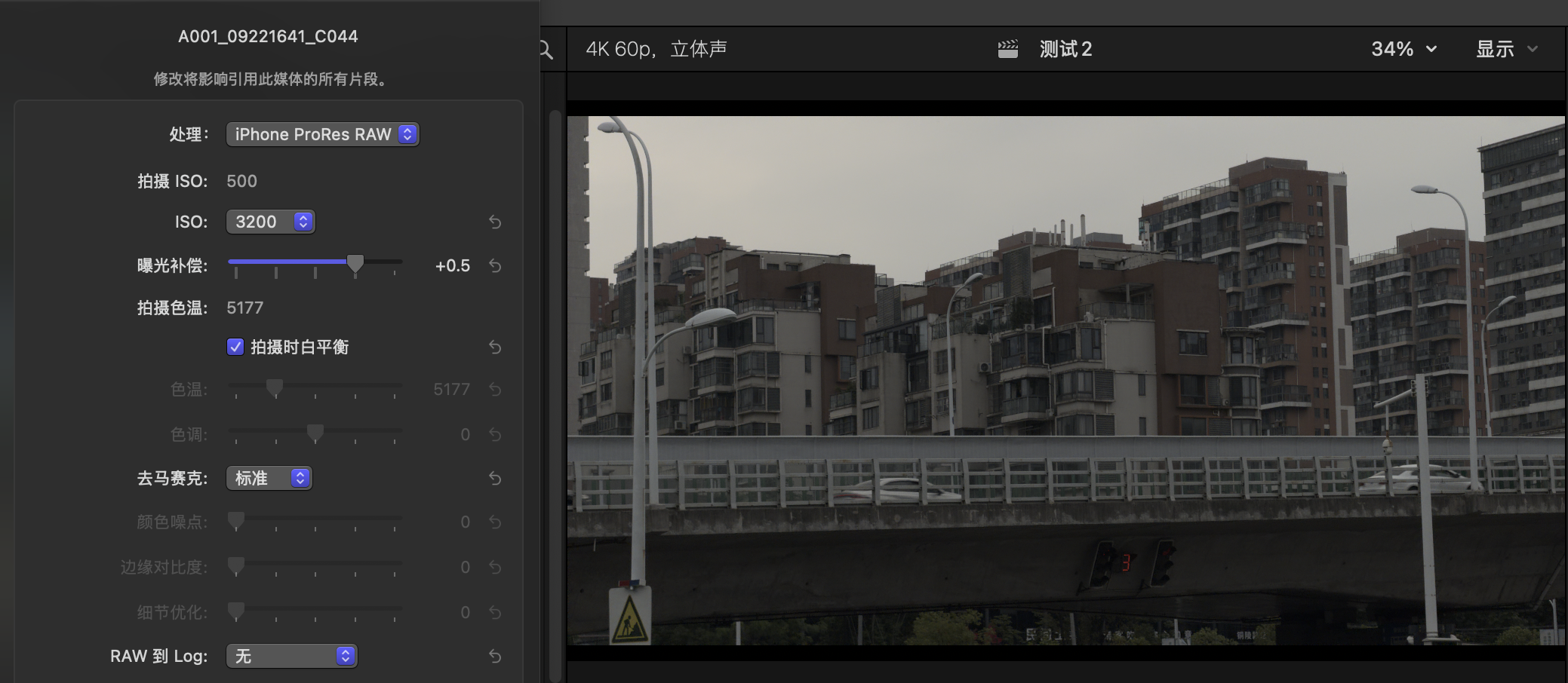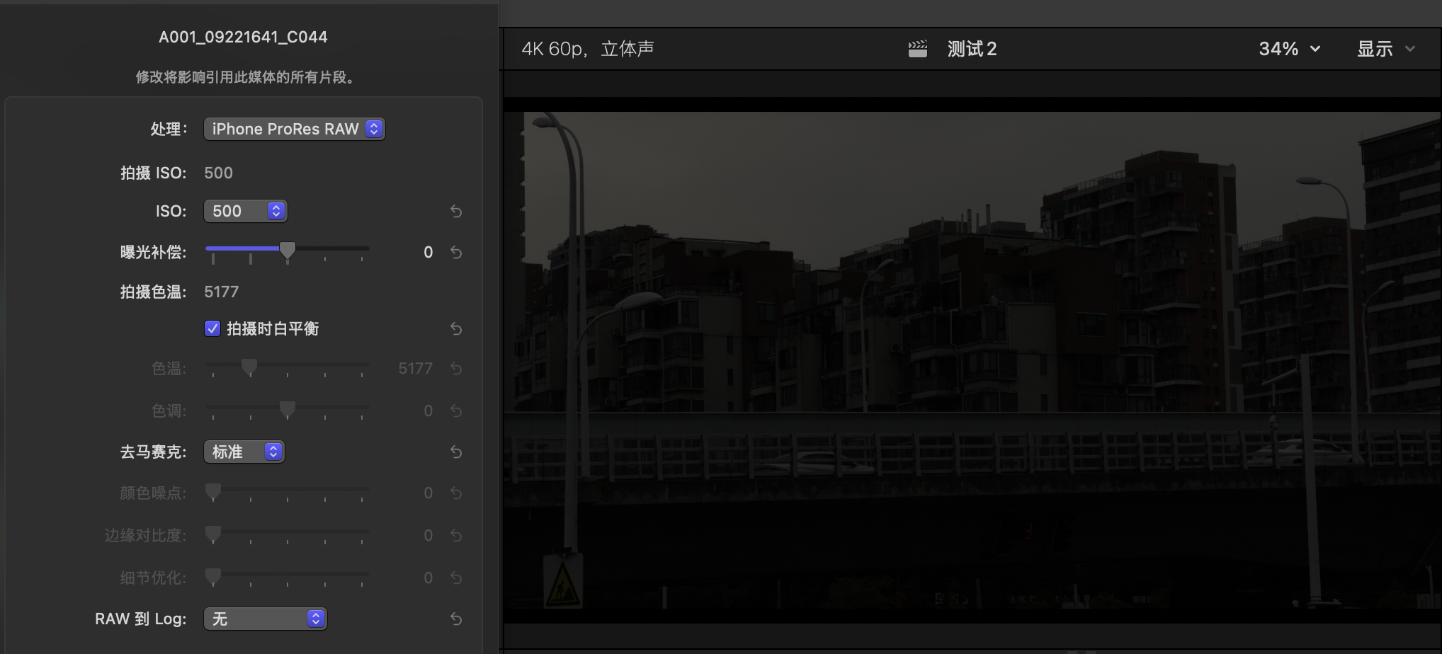 这几天天气不是很好,所以测试很有局限,不过ProRes RAW的宽容性还是很强的,这里我特意拍摄了过曝和欠曝的场景,都可以快速拉回来细节,而拍摄就算是白平衡乱设置,也能完全救回来。
