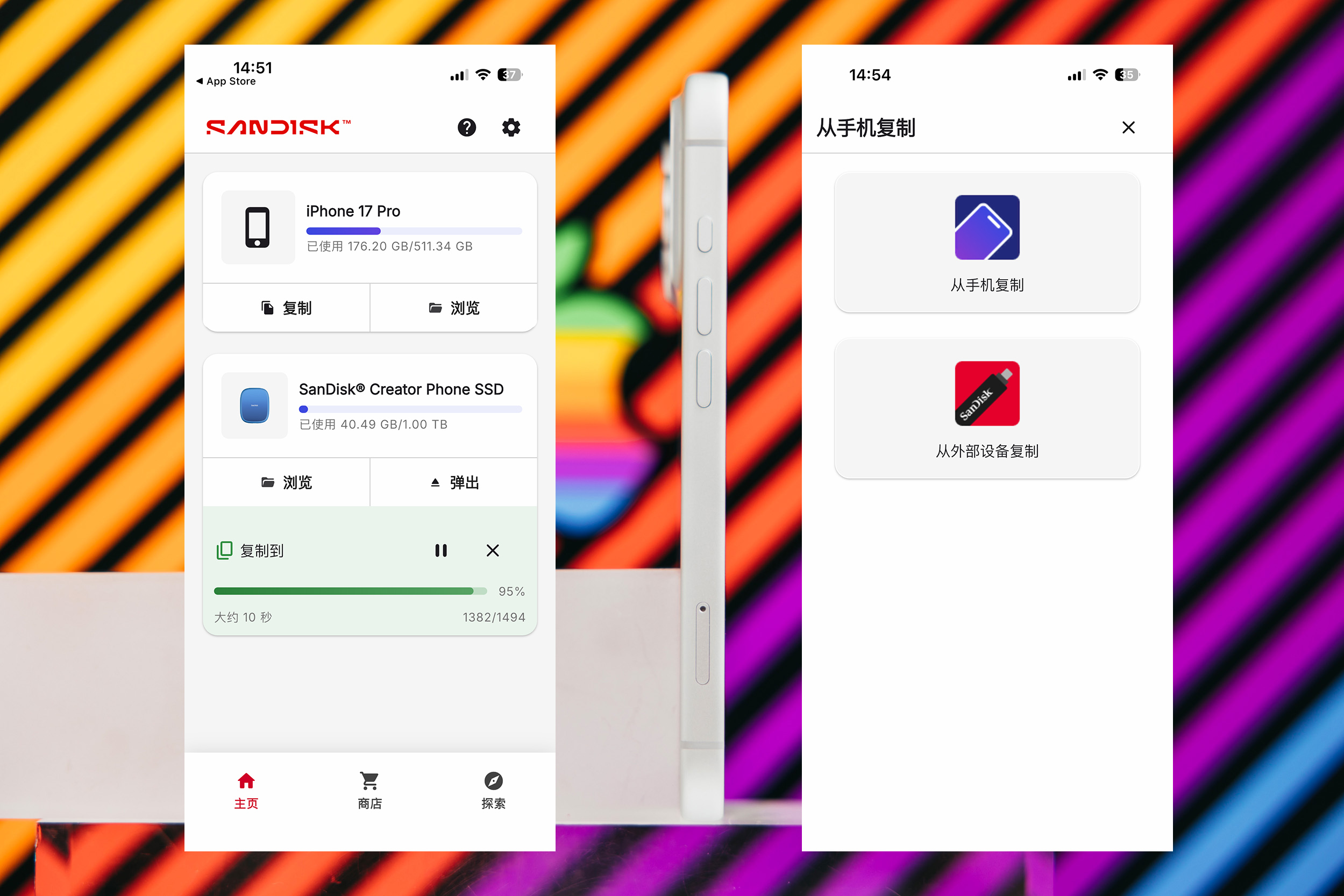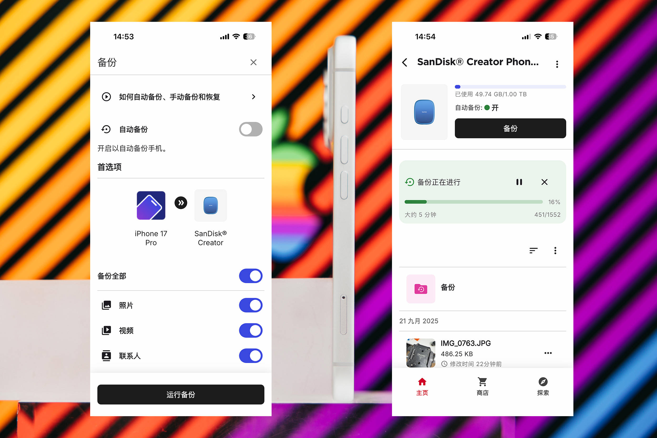闪迪存储地带应用程序(Memory Zone APP),除了日常拍摄作为存储设备,你还可以用它备份手机的照片、视频和联系人,所以它不只是一个外挂拍摄固态硬盘而已,也是个很好的趁手工具,就算你没有专业拍摄需求,作为一个日常扩容工具,也是不错的。