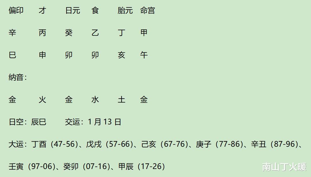 丙正财地支得巳禄、午刃、1纳音火,丁偏财地支得巳禄、午刃、1纳音火,合计2.5强根力量。