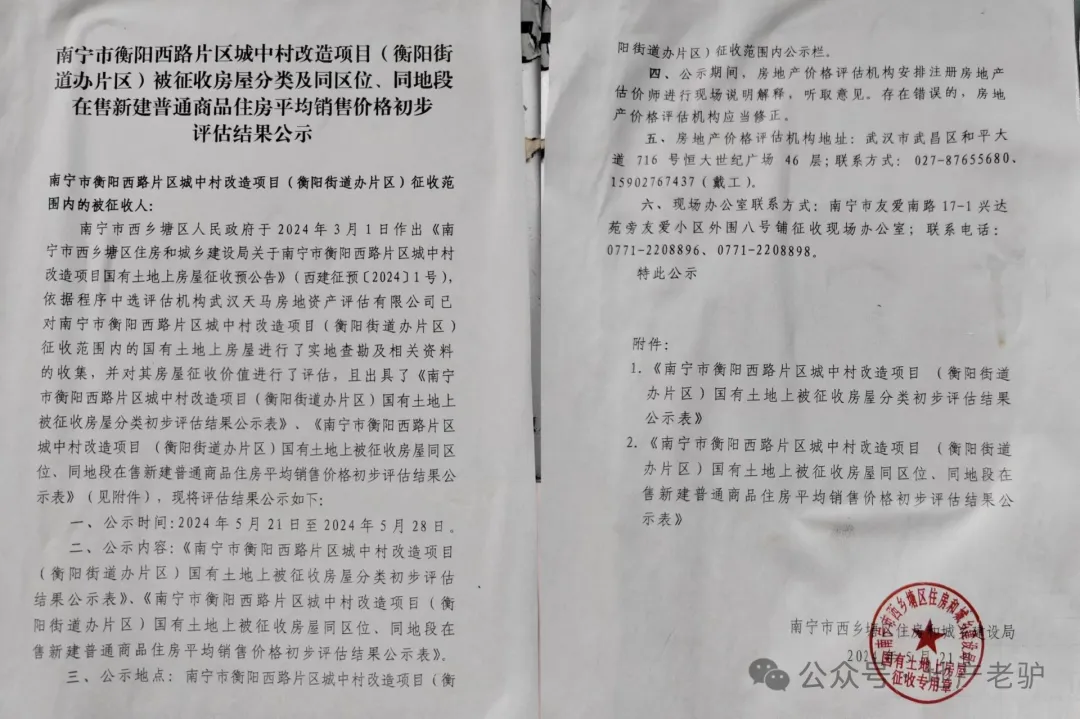 6页的公告文件,简单来说就是,西乡塘区政府根据中选机构武汉天马房地资产评估有限公司对衡阳西路片区城中村改造项目(衡阳街道办片区)国有土地上的房屋征收价值进行评估。