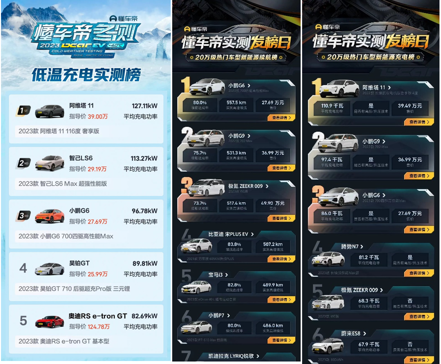 懂车帝2023年冬测正在进行,通过已发布的低温充电实测榜可以看出具有800V系统的阿维塔,智己和小鹏在低温充电优势明显;而同为800v平台的奥迪RS,按纸面实力应该是第一,确因和现场的液冷超充终端不兼容,不能实现高压快充,成绩落后。