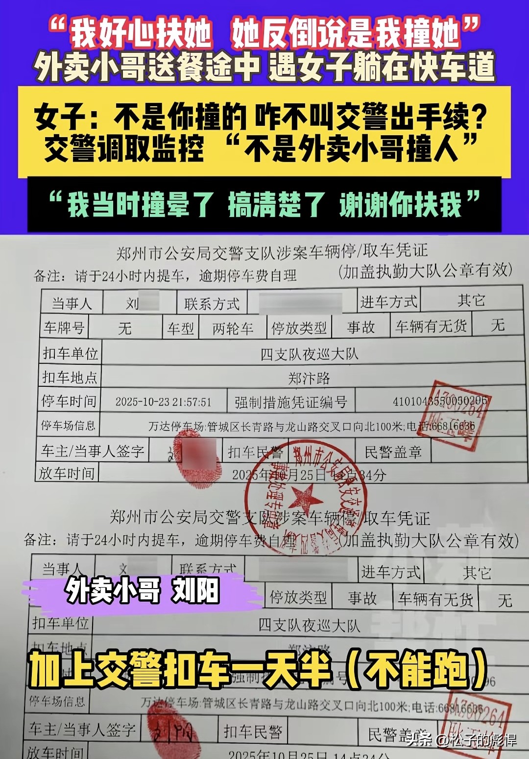交警已经和小哥联系过,一开始扣他车是因为女子就说是她撞的,调取监控后确定不是小哥撞的。