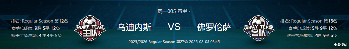 佛罗伦萨目前排名第16位,积分24分,联赛压力较大,近三场比赛表现稍好,先是客场3-0大胜比亚韦,随后主场1-0击败比萨,但最近一场主场0-3惨败于比亚韦,佛罗伦萨近10场比赛取得4胜2平4负,胜率为4成,场均进球1.4,场均失球1.5,客场表现相对稳定,近四个客场胜下三场,球队进攻端有所提升,但防守漏洞依然较大,整体状态略优于乌迪内斯。