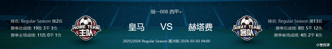 赫塔菲目前排名第13位,积分29分,处于联赛中下游,近三场比赛分别是主场0-1负于塞维利亚、主场2-1击败比利亚雷、客场2-0战胜阿拉维斯,球队近10场比赛仅取得2胜3平5负,胜率为2成,场均进球0.8,场均失球1.4,球队攻防两端表现一般,客场战绩平平,近期状态波动较大,球队整体实力与皇马存在明显差距,面对强队时防线容易出现漏洞。