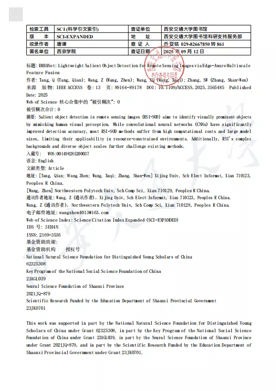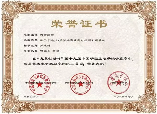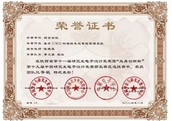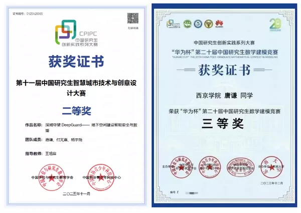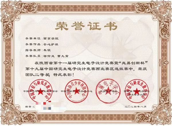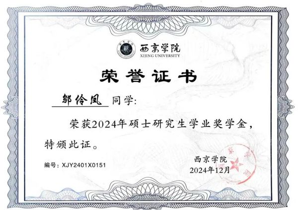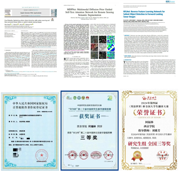 硕士期间,他发表SCI论文2篇、中文普刊1篇,授权软件著作权1项,考取Python软件开发工程师证书,参与多项科研项目;竞赛之路捷报频传,以第一作者身份斩获研究生智慧城市技术与创意设计大赛国家级二等奖、三等奖,多次在电子设计竞赛中获奖,学业上连续斩获西京学院研究生一、二、三等奖学金,是科研与实践兼备的全能型学子。