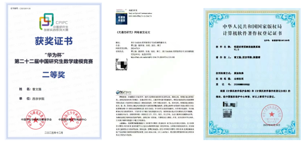 他是科研与竞赛双优的典范,硕士期间发表SCI论文中科院一区1篇、二区2篇、三区1篇,授权软件著作权2项;同时斩获西京学院研究生一、二等奖学金,研究生数学建模竞赛全国三等奖,英语翻译类赛事省奖乃至全国三等奖等多项荣誉,用亮眼的成绩单证明了自己的实力。