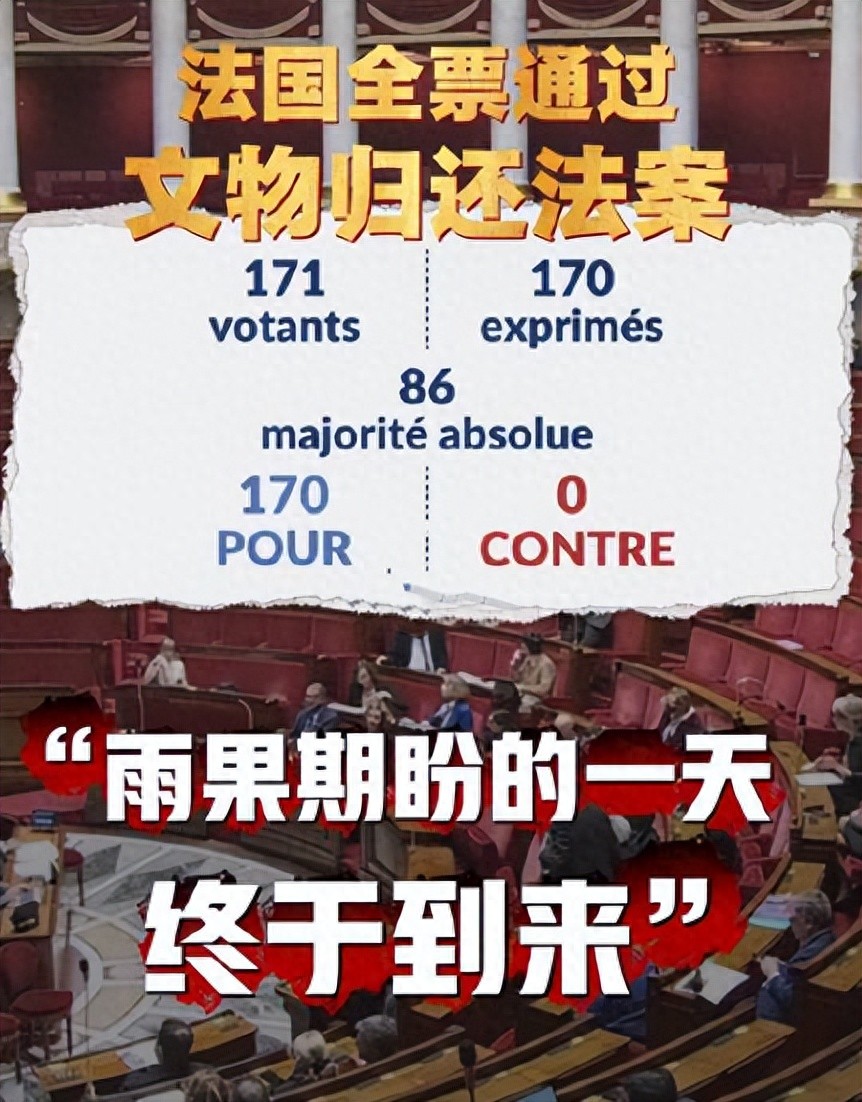 当地时间4月13日,法国国民议会以170票赞成、0票反对通过一项法案,将简化法国在殖民时期掠夺所得文物的归还程序。议员热雷米·帕特里耶-莱图斯发言时,说到法国文豪维克多·雨果的梦想:“法兰西能脱胎换骨,将不义之财归还被抢掠的中国”,他直言“这一天终于到来”。