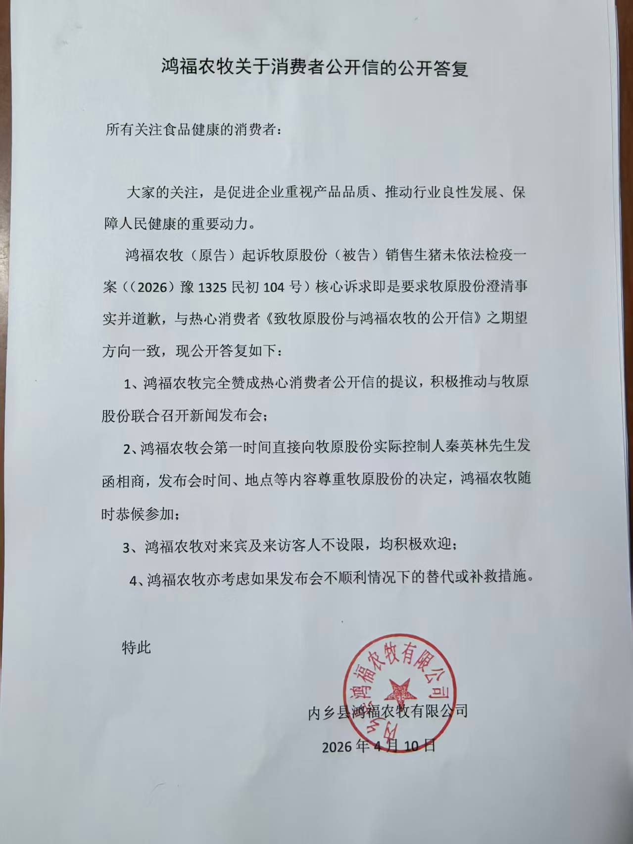 以下,是鸿福农牧正式回应《公开信》的函。