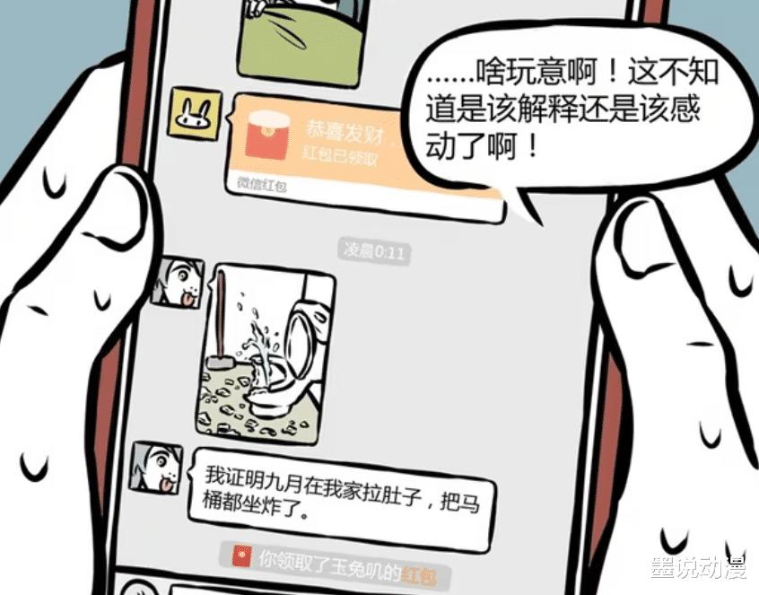 此时哮天上传了一张照片,内容是哮天家的马桶炸了。哮天证明九月在他家拉肚子,而且把马桶坐炸了。哮天为了给九月救场,那是相当拼命,不过旁边有个锤子,老肚只要不傻,就知道哮天是故意的。这一次请假,堪称灾难级。哮天这算是帮倒忙,估计九月只能老老实实去开会。