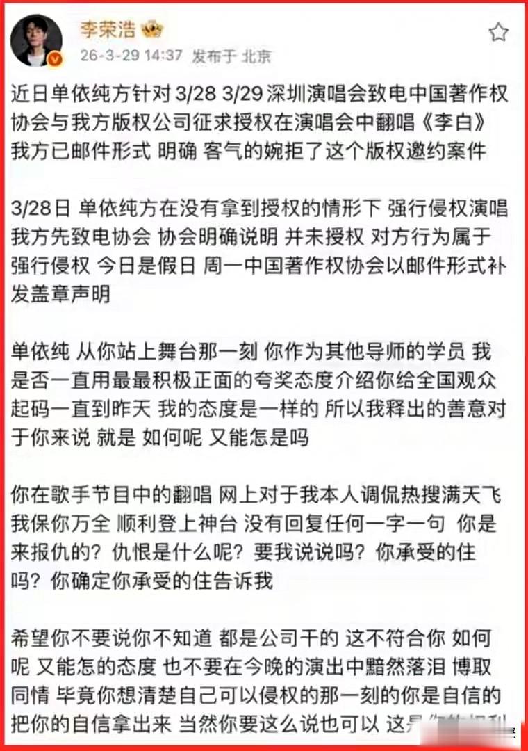 这波操作彻底惹怒了李荣浩,直接在社交平台发长文怒斥,言辞犀利不留情面。