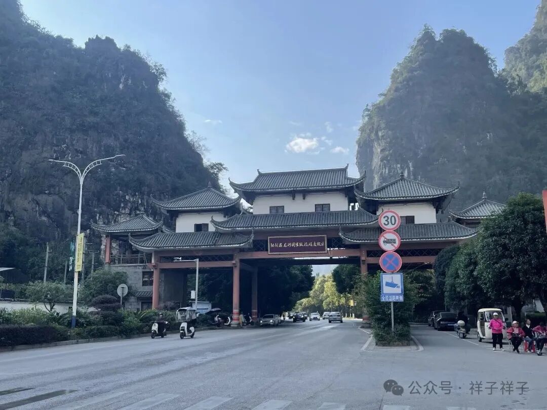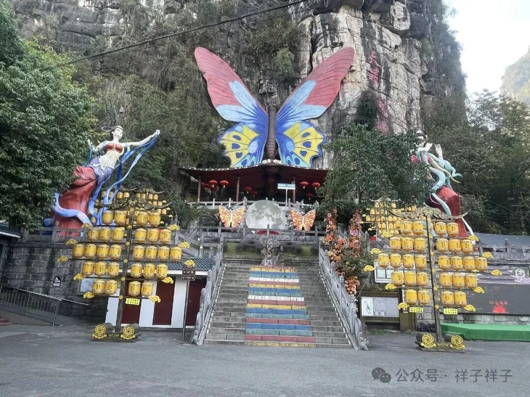从工农桥至月亮山,结果景区没开,沿途是如诗如画的峰林与田园,收获了蝴蝶泉、大榕树等景点,蝴蝶泉的标志就是这只巨大且色彩斑斓的蝴蝶。