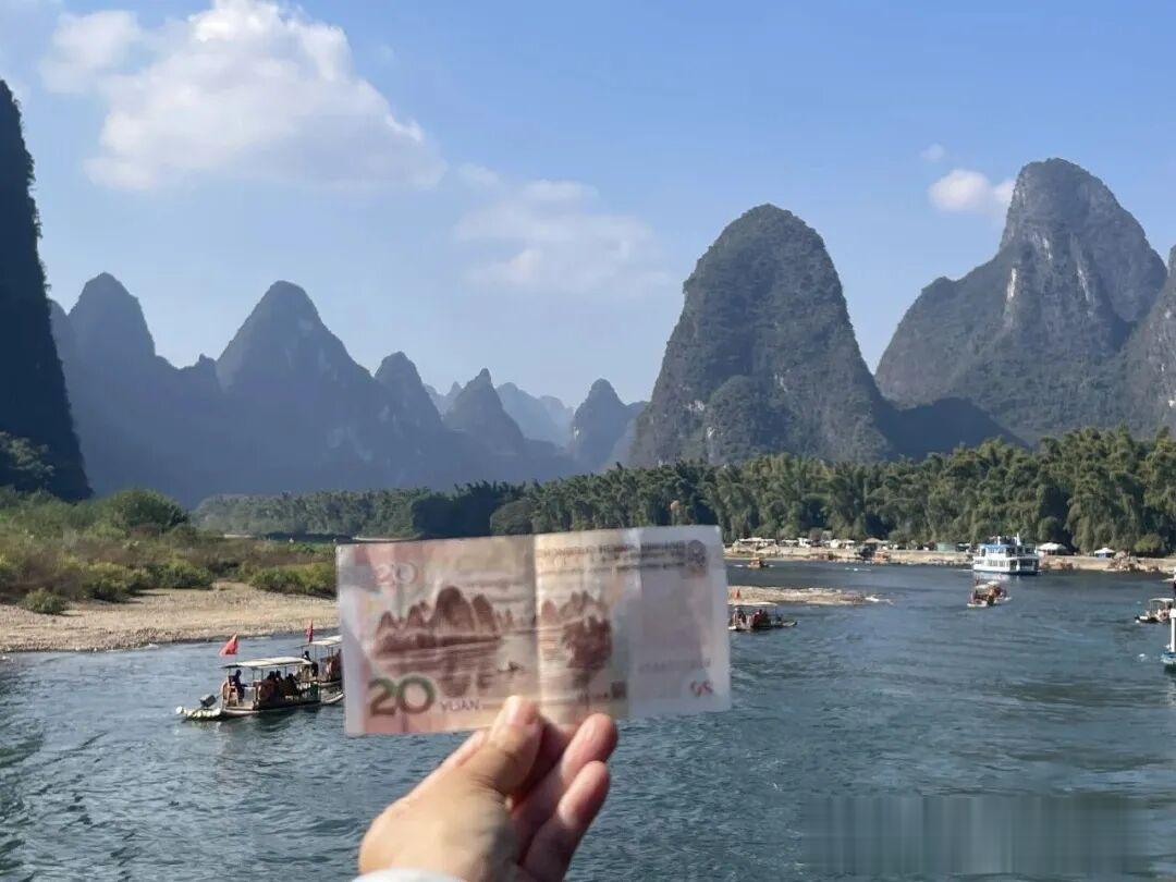 景区最有名的黄布倒影,即20元人民币取景点,还未到景点,甲板就挤满了人,很多人都拿出20元纸币准备着。原来需要回头远望,稍纵即逝,非常考验眼力,最终还是没能很好地把握住时机!!