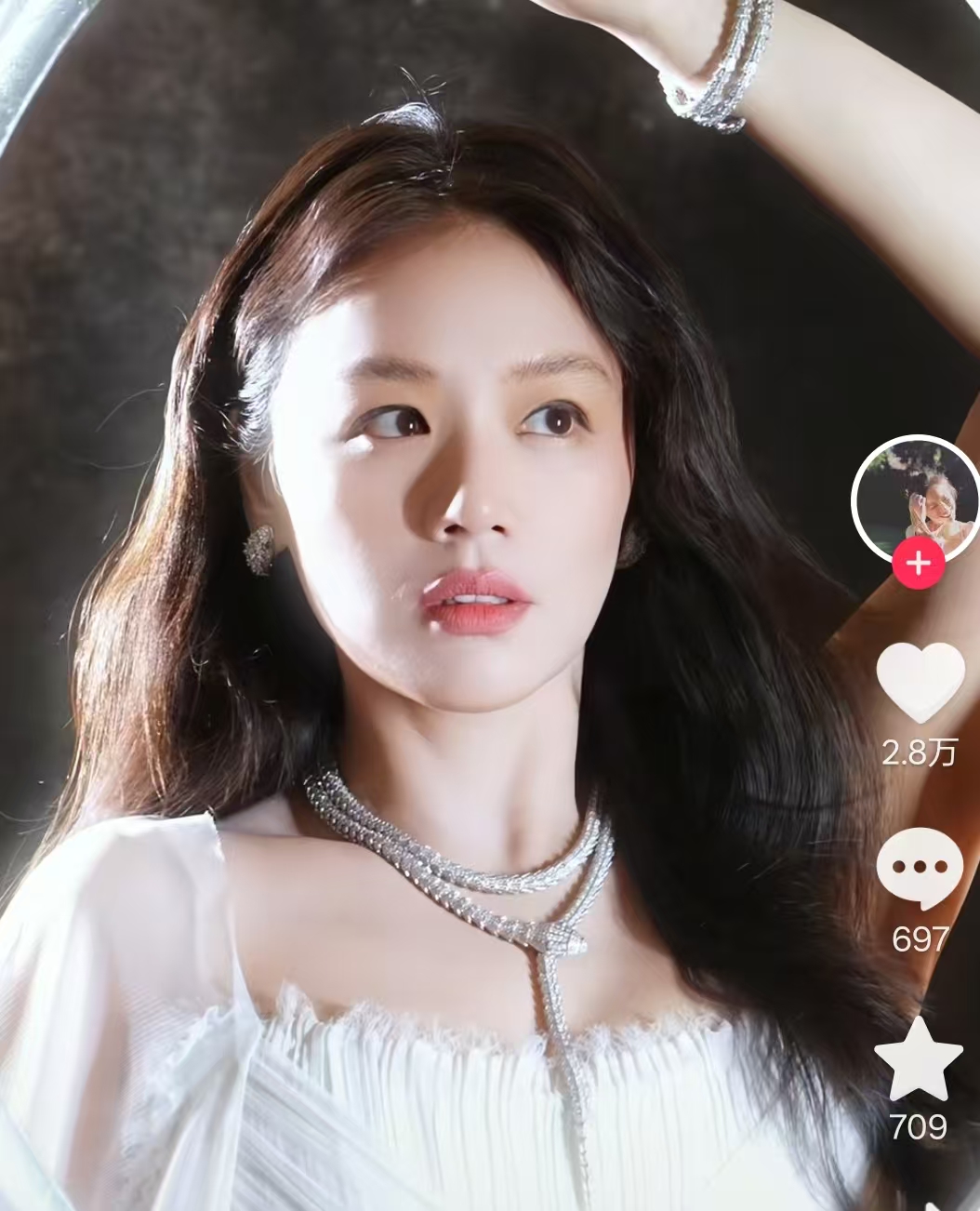 身上穿着纯白色的裙子,脖子上戴着一条重工的项链,头发散落在胸前,她微微仰着头。