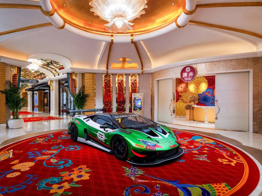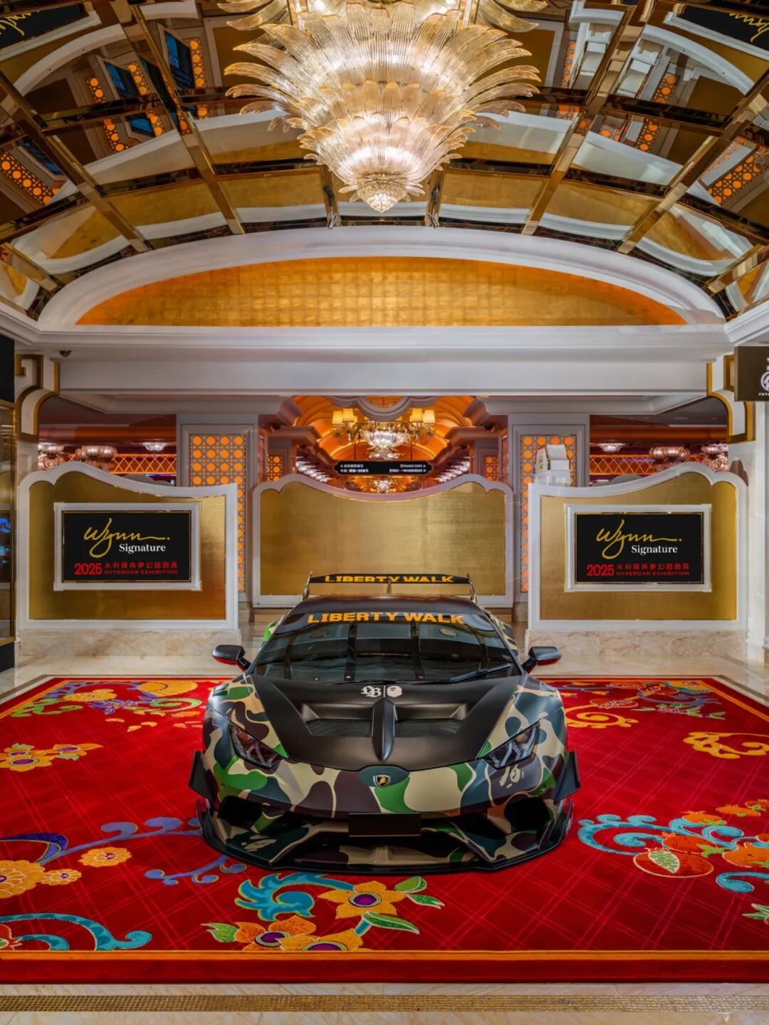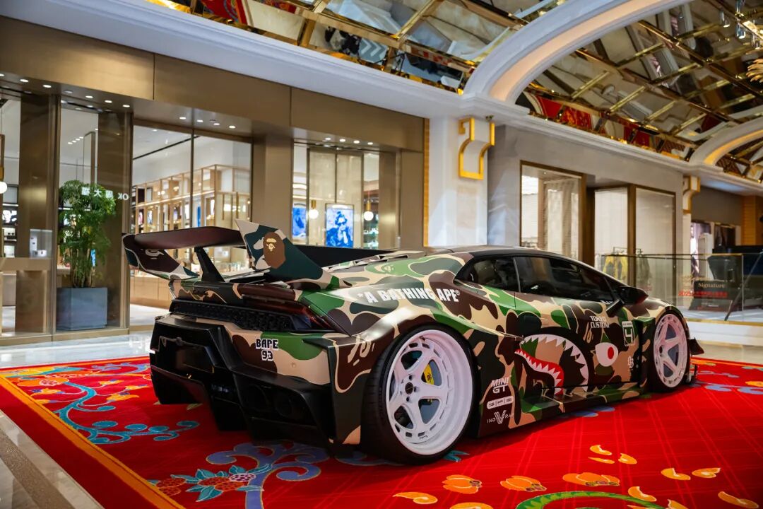涂装上A BATHING BAPE®标志性ABC CAMO绿色迷彩的LB-Silhouette WORKS兰博基尼Huracán GT,在永利皇宫气派恢弘的长廊中,激荡着都市时尚文化与超跑设计的创意火花。此次合作的意义远不止一台跑车, 它是日本街头潮流与改装文化、意大利超跑灵魂 以及东西方尖端改装技术的深度融合,已然成为全球设计与创意文化的庆典。