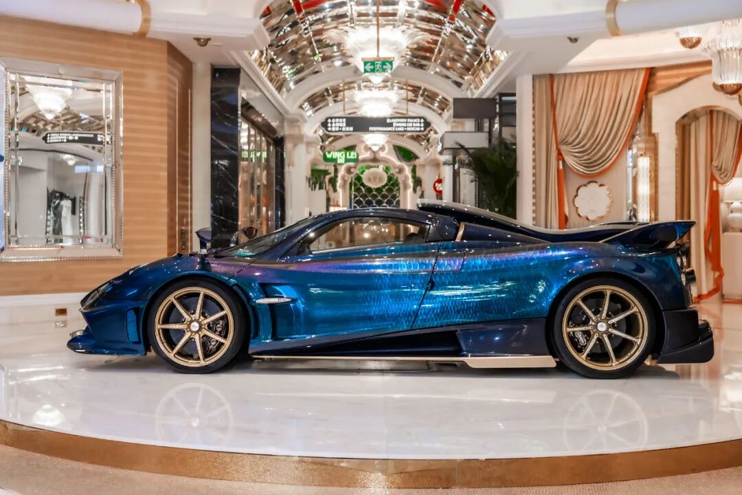 不仅于此,在永利皇宫,现场还展出了一辆由泰国藏家私人定制的帕加尼Huayra Imola Roadster 'Nāga',整车采用全碳车身,涂装布满蓝紫色蛇鳞,美轮美奂。Nāga是东南亚文化中象征神秘与尊贵的“蛇神”,而该车则采用特别的“SERPENTI”蛇鳞涂装与之呼应。不仅于此,这辆顶级超跑的中控台、挡杆、仪表盘等地方全部镶嵌满了宝石,可见其顶级地位。该车全球仅一台,价值1.56亿港币,此次“永利臻典梦幻超跑展”也是该超跑的全球首次亮相。