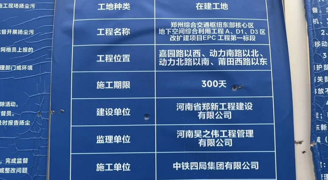 工地出入口门头上,可见“郑州综合交通枢纽东部核心区地下空间综合利用工程”的字样。