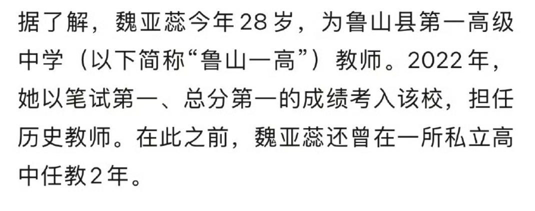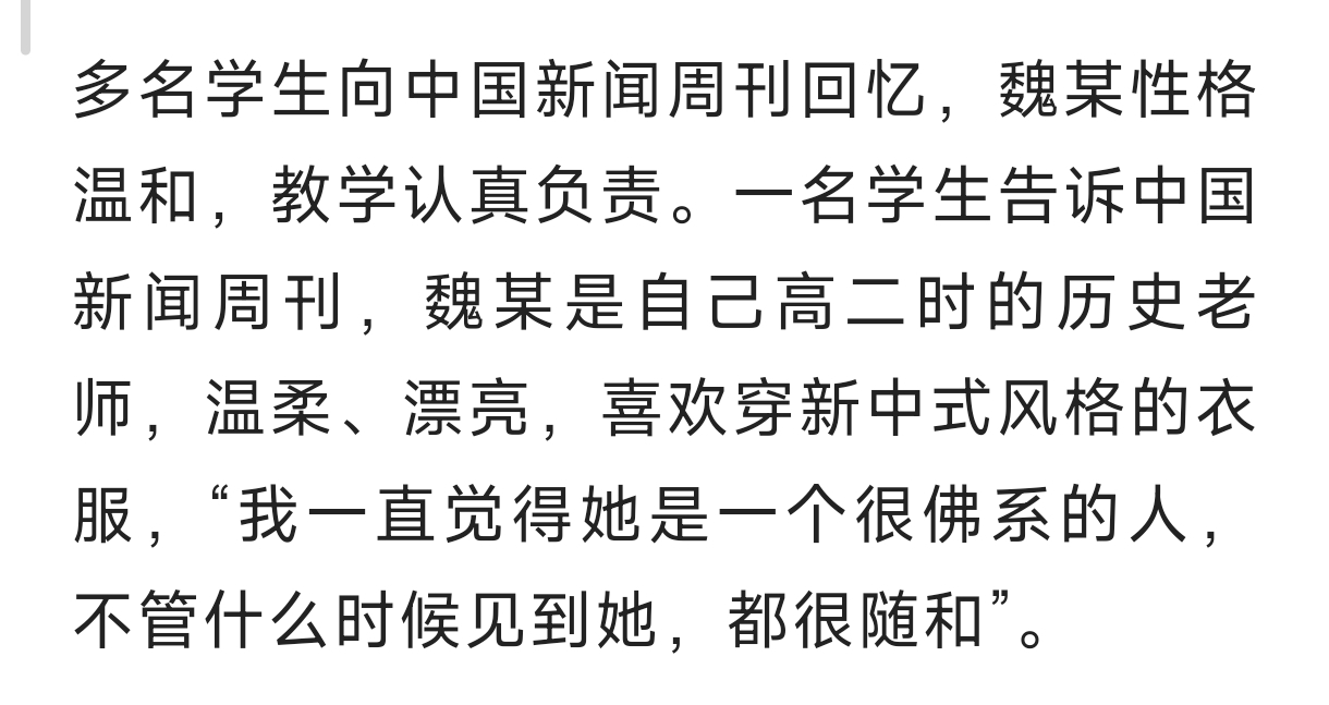 魏某是学历史的,非常优秀,她是以笔试第一、综合成绩第一的成绩进入鲁山县第一高级中学的。学生和同事对她的评价非常高。