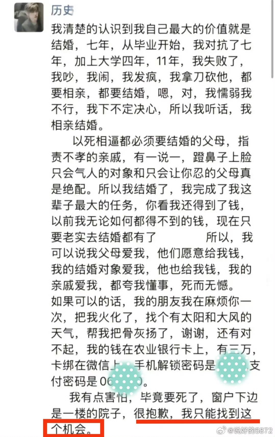 其实,当我第一看到她的遗言时,全是“冷漠”“无情”和“绝望”,没有一点温度。只要结婚,父母和亲戚就很开心,就连对象也不理解她。她反驳过、抗争过,但都无济于事,只能接受现实,听从父母的安排,相亲结婚。最终,把她逼上了绝路。