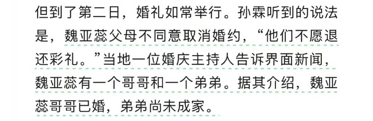据说,魏某有一个哥哥和一个弟弟,父母一直让她结婚,目的就是拿彩礼给没结婚的弟弟娶媳妇。只能说,魏某的父母还是重男轻女,根本就没有在乎女儿的感受。