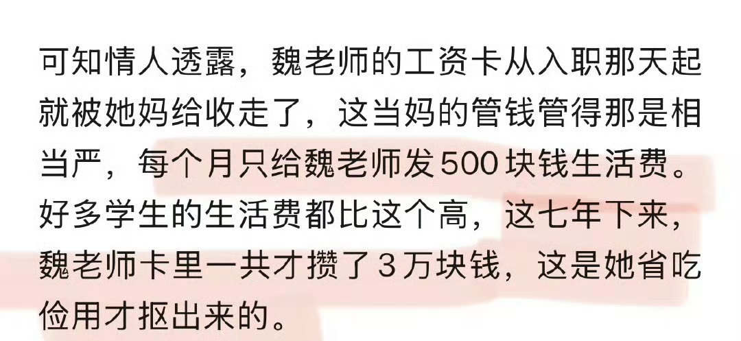据说,魏某工作后,工资几乎都被父母拿走了,每个月只给自己留500块钱的生活费。所以,她在遗言中才写到,以前她无论如何都得不到的钱,现在只要自己乖乖的结婚,父母和对象都会给她。所以,她卡里仅有的三万块钱,可能是结婚的时候父母和对象给的。