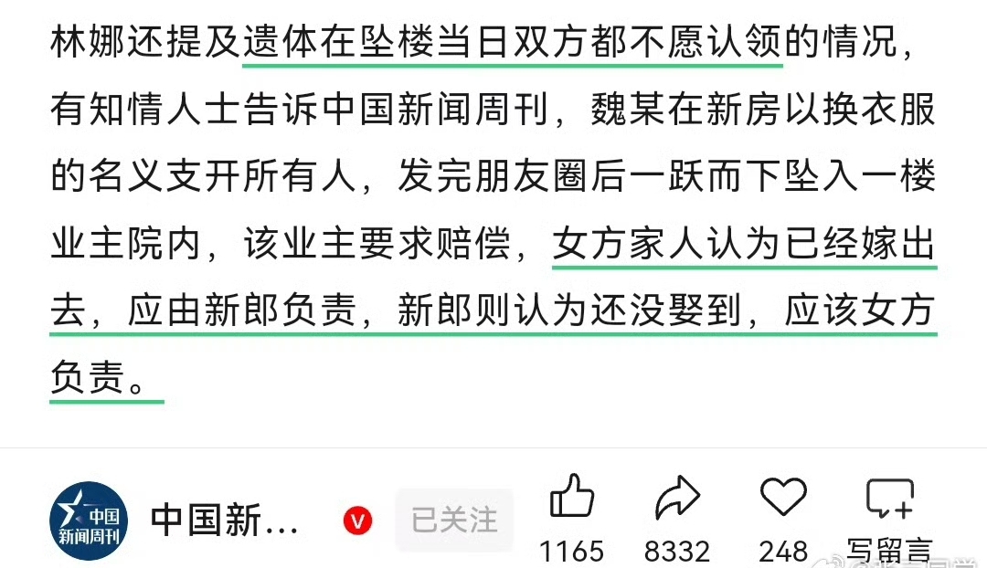 鲁山28岁女教师婚礼当天坠亡,婆家和娘家没有人第一时间主动出来管一管,一直在争论彩礼和遗体谁来管的问题。她用生命严重了验证了她的遗言,可能她早已料到,自己离世后,亲人没有人愿意给她收尸。
