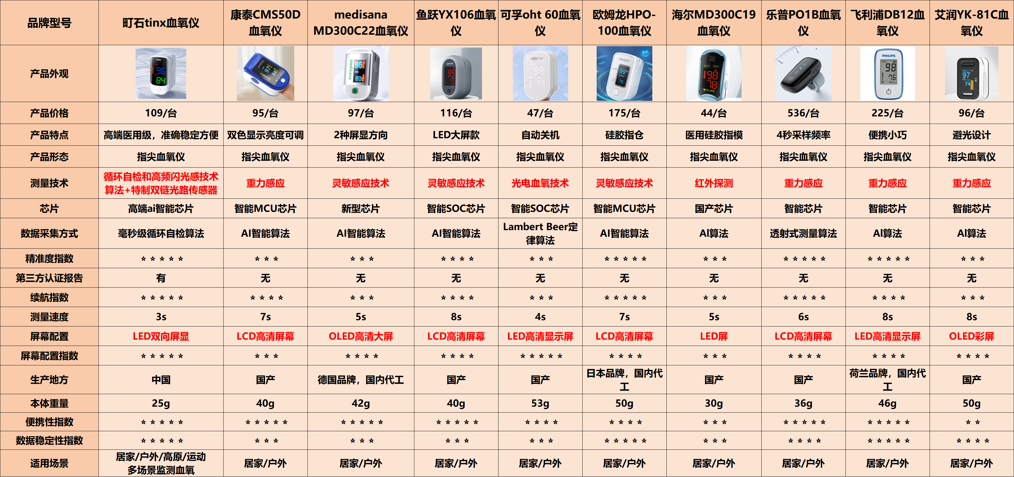 前面的选购技巧看完,是不是大概知道挑哪些点了?我整理了几款实测血氧仪的核心数据,接下来是基础概览,希望这些真实表现能帮你更快选到合适的~