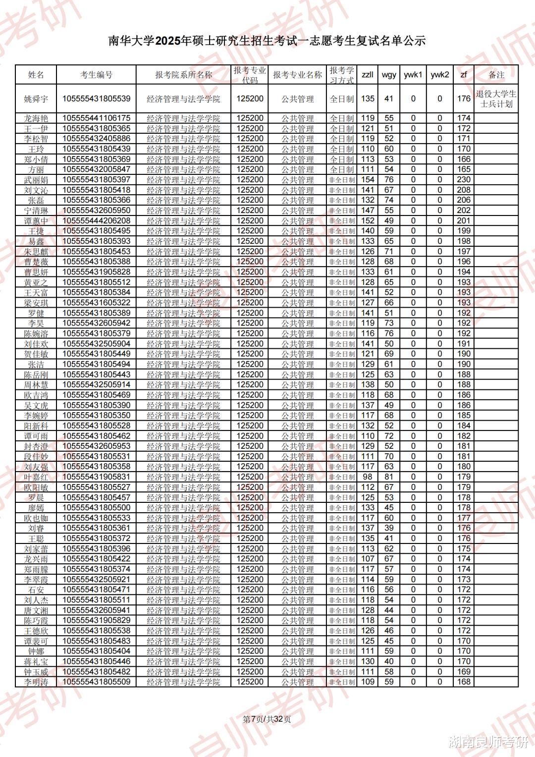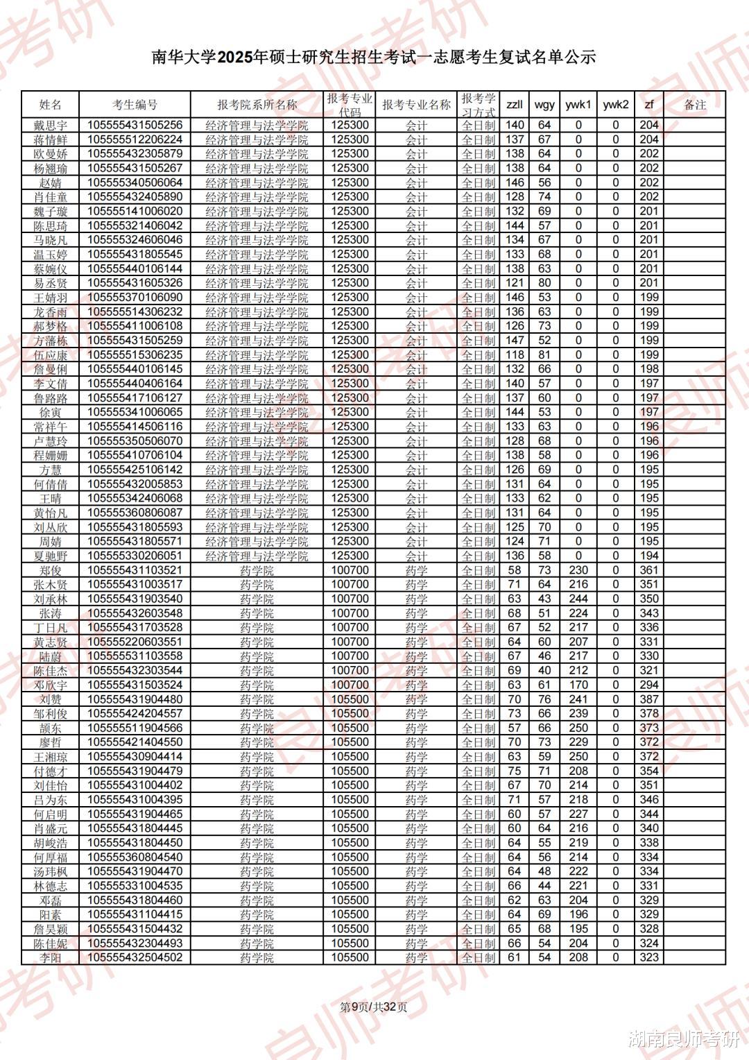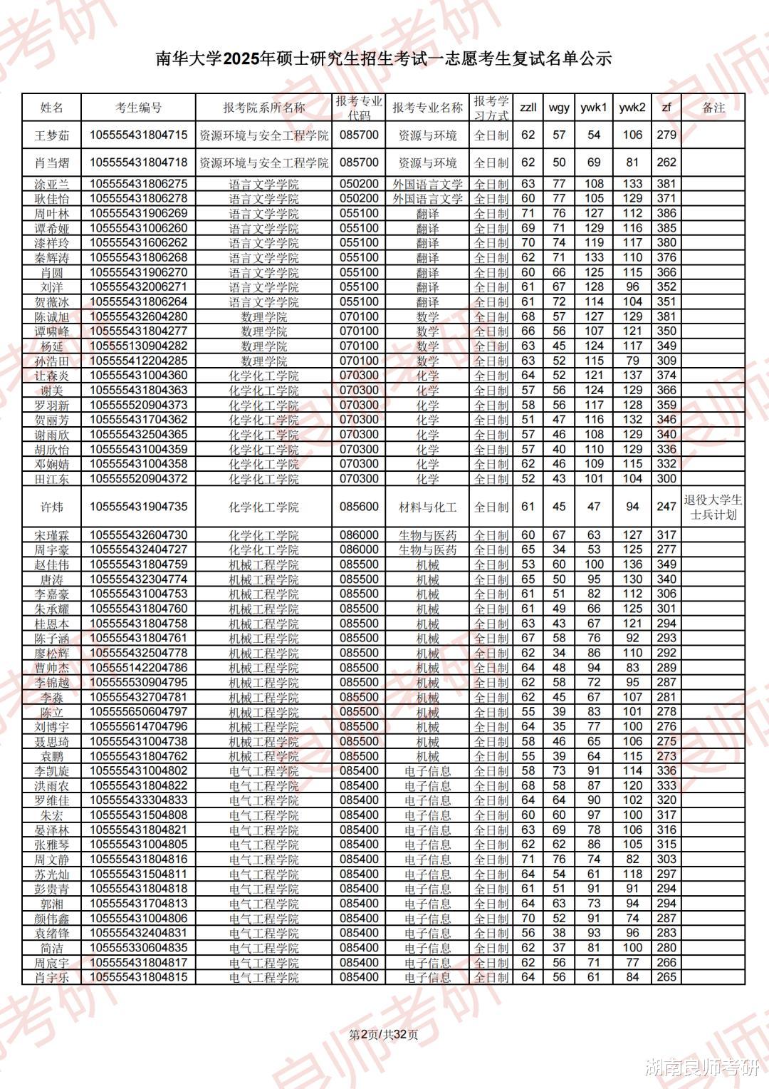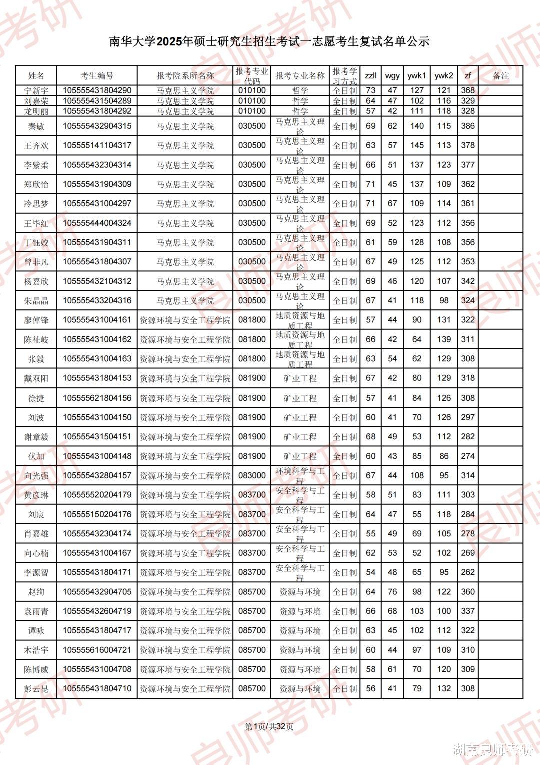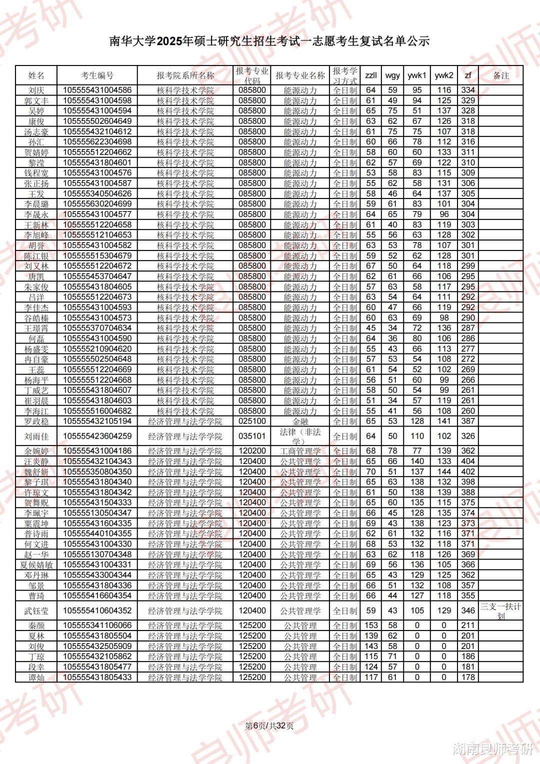 南华大学考研一志愿复试名单及分数